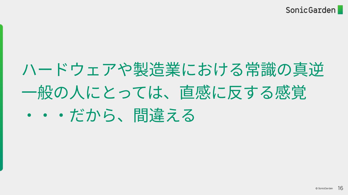 © SonicGarden ハードウェアや製造業における常識の真逆 ⼀般の⼈にとっては、直感に反する感覚 ‧‧‧だから、間違える 16