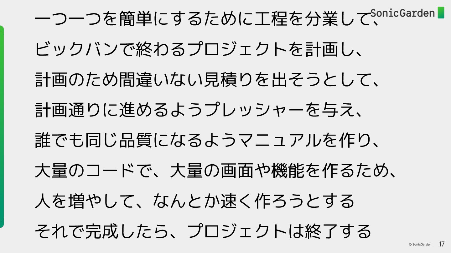 © SonicGarden 17 一つ一つを簡単にするために工程を分業して、 ビックバンで終わるプロジェクトを計画し、 計画のため間違いない見積りを出そうとして、 計画通りに進めるようプレッシャーを与え、 誰でも同じ品質になるようマニュアルを作り、 大量のコードで、大量の画面や機能を作るため、 人を増やして、なんとか速く作ろうとする