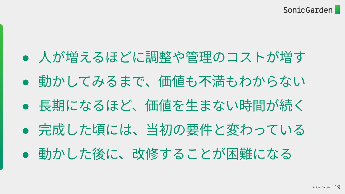© SonicGarden • ⼈が増えるほどに調整や管理のコストが増す • 動かしてみるまで、価値も不満もわからない • ⻑期になるほど、価値を⽣まない時間が続く • 完成した頃には、当初の要件と変わっている