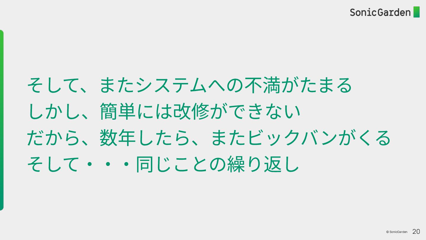 © SonicGarden そして、またシステムへの不満がたまる しかし、簡単には改修ができない だから、数年したら、またビックバンがくる そして‧‧‧同じことの繰り返し 20