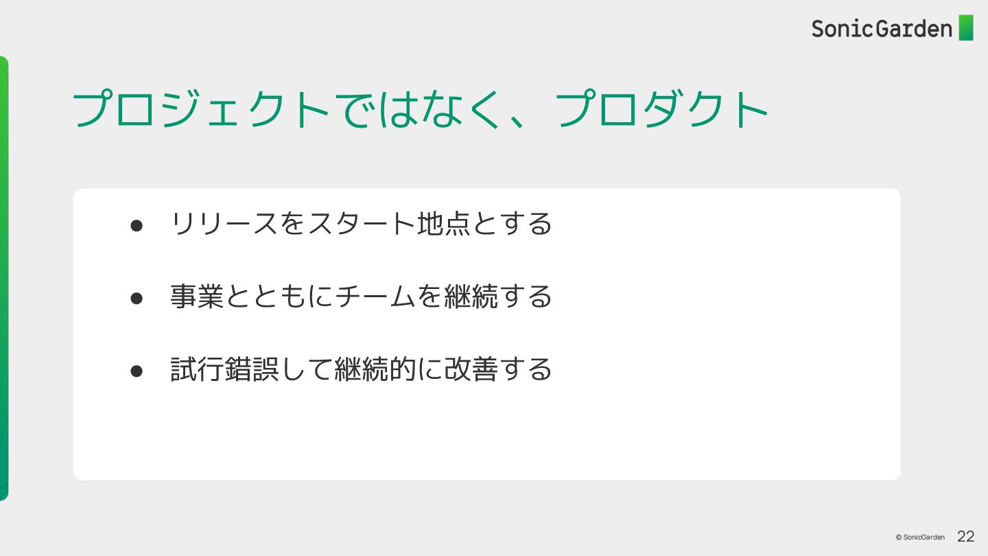 © SonicGarden 22 プロジェクトではなく、プロダクト • リリースをスタート地点とする • 事業とともにチームを継続する • 試行錯誤して継続的に改善する