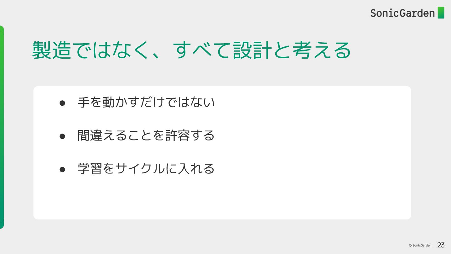 © SonicGarden 23 製造ではなく、すべて設計と考える • 手を動かすだけではない • 間違えることを許容する • 学習をサイクルに入れる