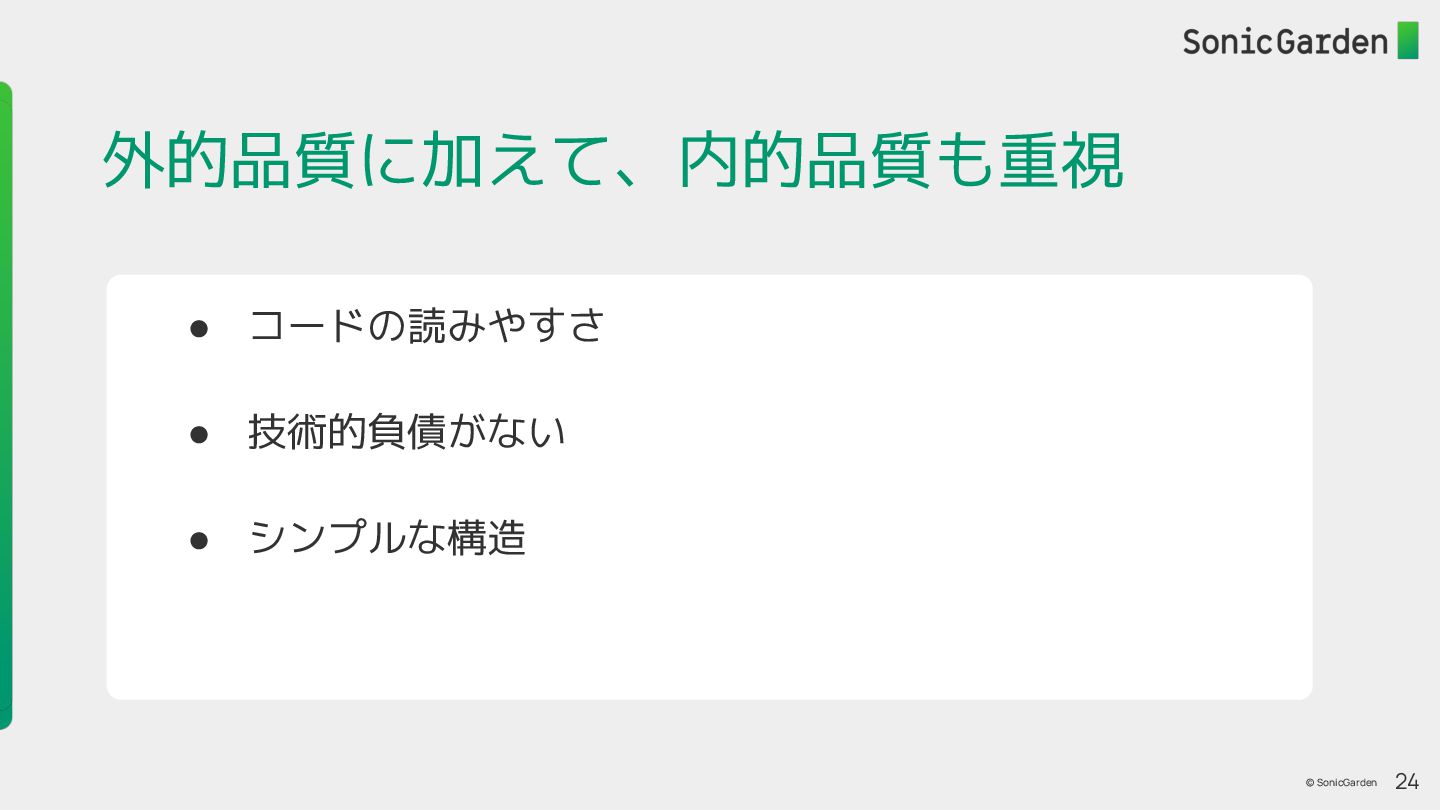 © SonicGarden 24 外的品質に加えて、内的品質も重視 • コードの読みやすさ • 技術的負債がない • シンプルな構造