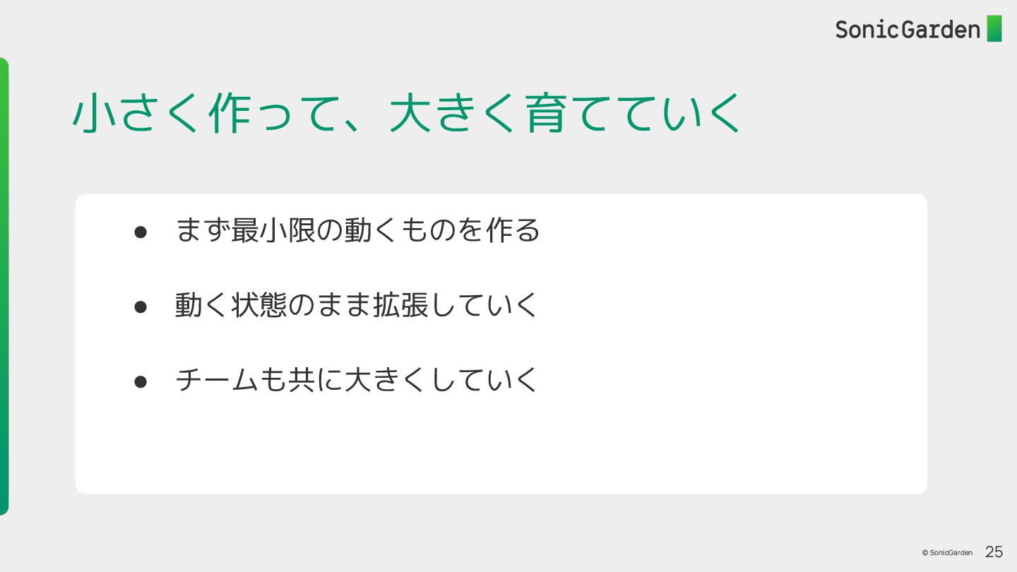 © SonicGarden 25 小さく作って、大きく育てていく • まず最小限の動くものを作る • 動く状態のまま拡張していく • チームも共に大きくしていく