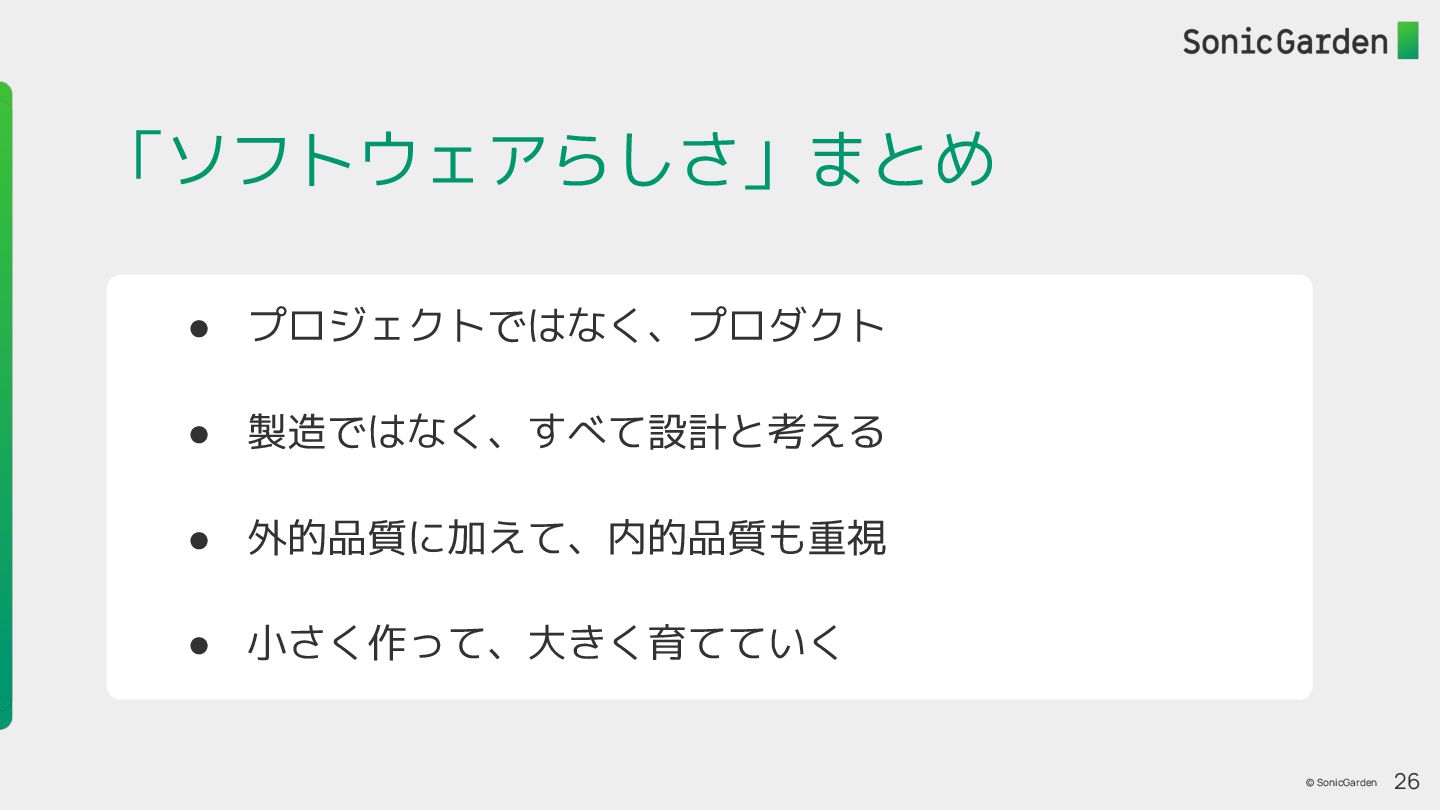 © SonicGarden 26 「ソフトウェアらしさ」まとめ • プロジェクトではなく、プロダクト • 製造ではなく、すべて設計と考える • 外的品質に加えて、内的品質も重視