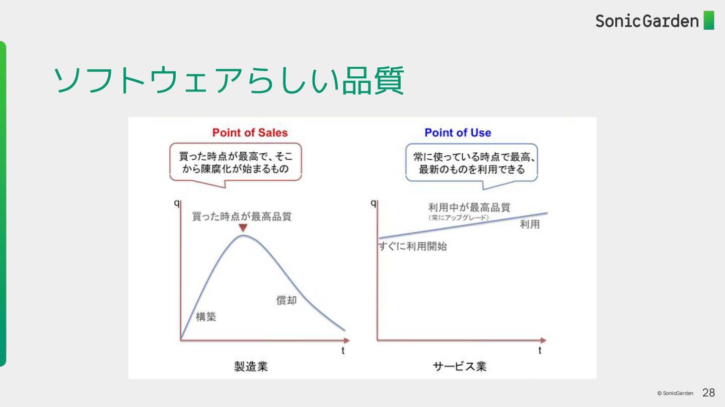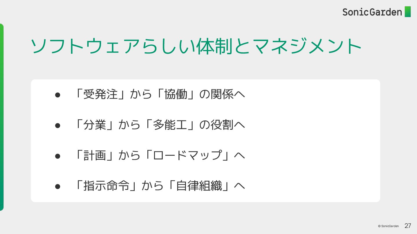 © SonicGarden 27 ソフトウェアらしい体制とマネジメント • 「受発注」から「協働」の関係へ • 「分業」から「多能工」の役割へ • 「計画」から「ロードマップ」へ