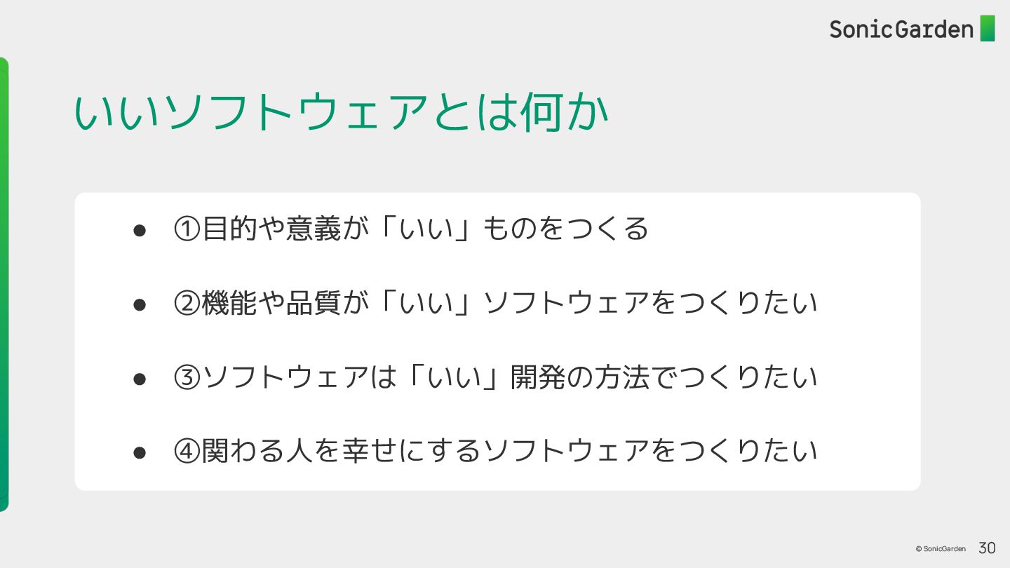 © SonicGarden 30 いいソフトウェアとは何か • ①目的や意義が「いい」ものをつくる • ②機能や品質が「いい」ソフトウェアをつくりたい • ③ソフトウェアは「いい」開発の方法でつくりたい
