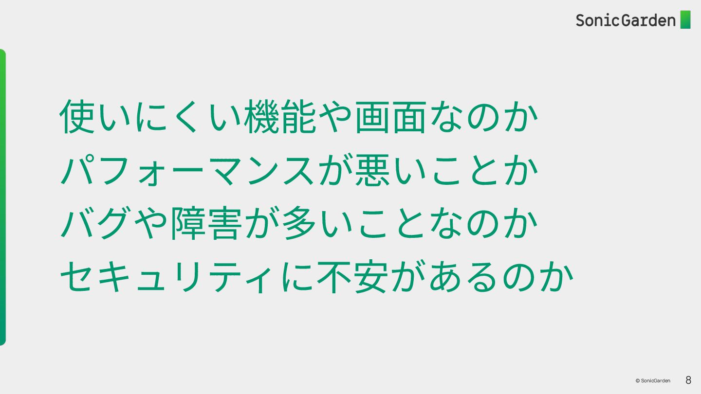 © SonicGarden 使いにくい機能や画⾯なのか パフォーマンスが悪いことか バグや障害が多いことなのか セキュリティに不安があるのか 8