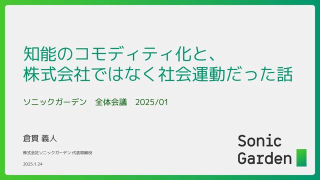 知能のコモディティ化と、 株式会社ではなく社会運動だった話 倉貫 義人 株式会社ソニックガーデン 代表取締役 2025.1.24 ソニックガーデン 全体会議 2025/01