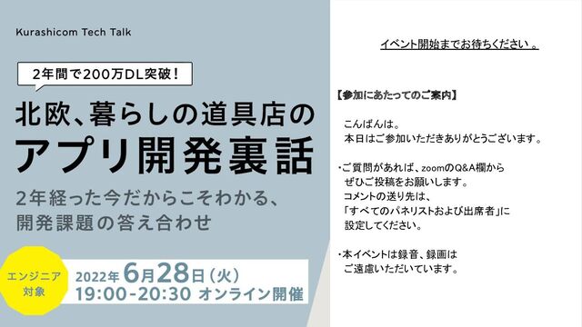 【エンジニア対象】2年間で200万DL突破!北欧、暮らしの道具店のアプリ開発裏話トークイベント開催します!6/28(火)19:00~(オンライン)|Kurashicom Tech Blog|note https://note.com/kurashicom_tech/n/ncb5a054da1d6