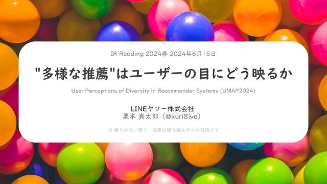 推薦リストの各アイテムに割り当てられたジャンルに基づく二項多様性[25]を使う 二項多様性は、ジャンルのカバレッジとリスト内の非冗長性の二つの成分の積として定義 l コンテンツベースの多様性(CB):CB-plot-ILD l CLIP[18]で映画や本の要約から得た埋め込みを使う (※ その他変種も一部実験では使われているが、本スライドでは説明を割愛) [25] Coverage, redundancy and size-awareness in genre diversity for recommender systems. (RecSys, 2014) [18] Learning transferable visual models from natural language supervision. (ICML, 2021)