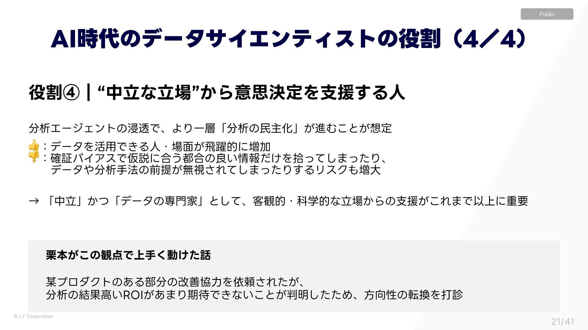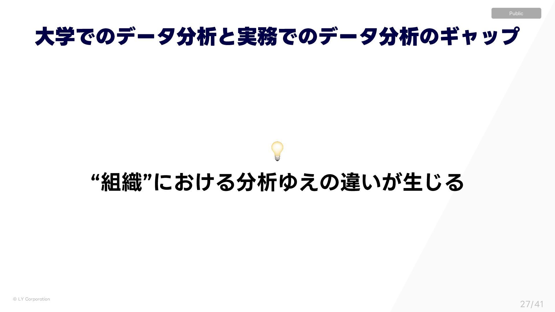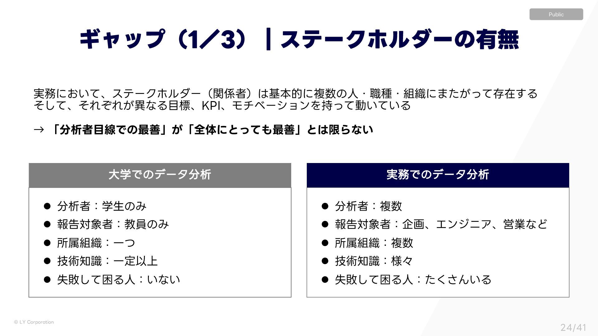 ٕज़ࣝɿҰఆҎ্ l ࣦഊͯ͠ࠔΔਓɿ͍ͳ͍ l ੳऀɿෳ l ใࠂରऀɿاըɺΤϯδχΞɺӦۀͳͲ l ॴଐ৫ɿෳ l ٕज़ࣝɿ༷ʑ l ࣦഊͯ͠ࠔΔਓɿͨ͘͞Μ͍Δ େֶͰͷσʔλੳ ࣮Ͱͷσʔλੳ ΪϟοϓʢʗʣʛεςʔΫϗϧμʔͷ༗ແ ࣮ʹ͓͍ͯɺεςʔΫϗϧμʔʢؔऀʣجຊతʹෳͷਓɾ৬छɾ৫ʹ·͕ͨͬͯଘࡏ͢Δ ͦͯ͠ɺͦΕͧΕ͕ҟͳΔඪɺ,1*ɺϞνϕʔγϣϯΛ࣋ͬͯಈ͍͍ͯΔ ˠ ʮੳऀઢͰͷ࠷ળʯ͕ʮશମʹͱͬͯ࠷ળʯͱݶΒͳ͍