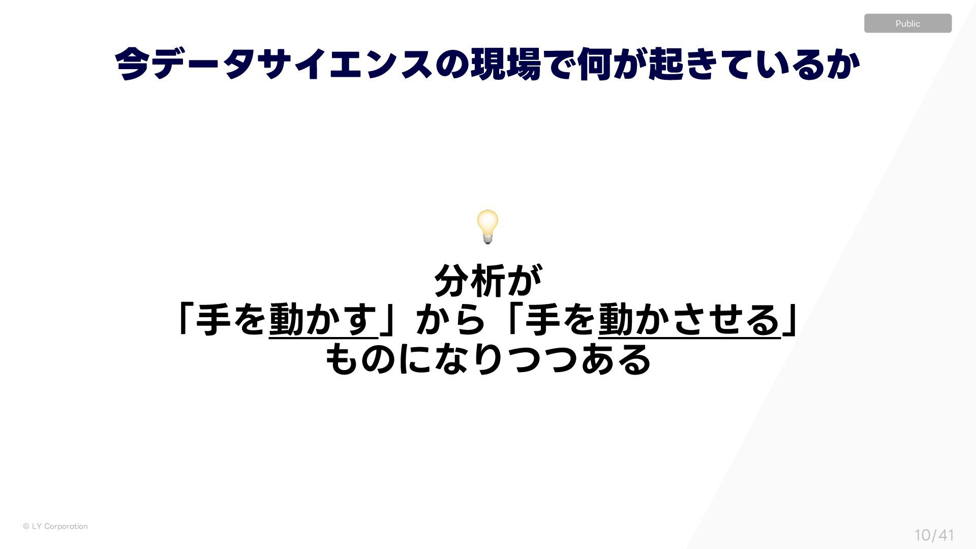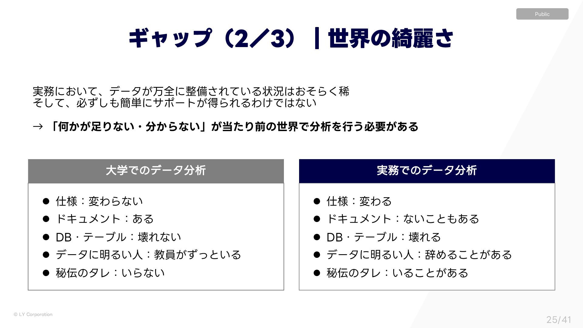 σʔλʹ໌Δ͍ਓɿڭһ͕ͣͬͱ͍Δ l ൿͷλϨɿ͍Βͳ͍ l ༷ɿมΘΔ l υΩϡϝϯτɿͳ͍͜ͱ͋Δ l %#ɾςʔϒϧɿյΕΔ l σʔλʹ໌Δ͍ਓɿࣙΊΔ͜ͱ͕͋Δ l ൿͷλϨɿ͍Δ͜ͱ͕͋Δ େֶͰͷσʔλੳ ࣮Ͱͷσʔλੳ Ϊϟοϓʢʗʣʛੈքͷ៉ྷ͞ ࣮ʹ͓͍ͯɺσʔλ͕ສશʹඋ͞Ε͍ͯΔঢ়گ͓ͦΒ͘ك ͦͯ͠ɺඞͣ͠؆୯ʹαϙʔτ͕ಘΒΕΔΘ͚Ͱͳ͍ ˠ ʮԿ͔͕Γͳ͍ɾ͔Βͳ͍ʯ͕ͨΓલͷੈքͰੳΛߦ͏ඞཁ͕͋Δ