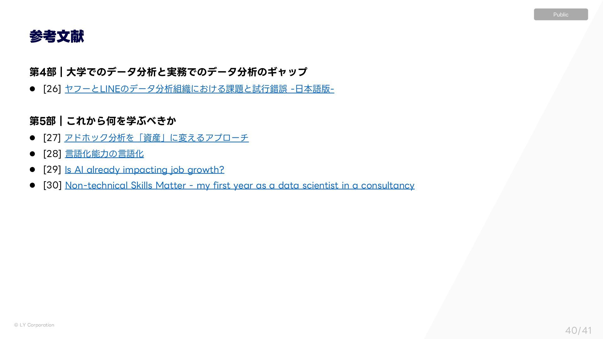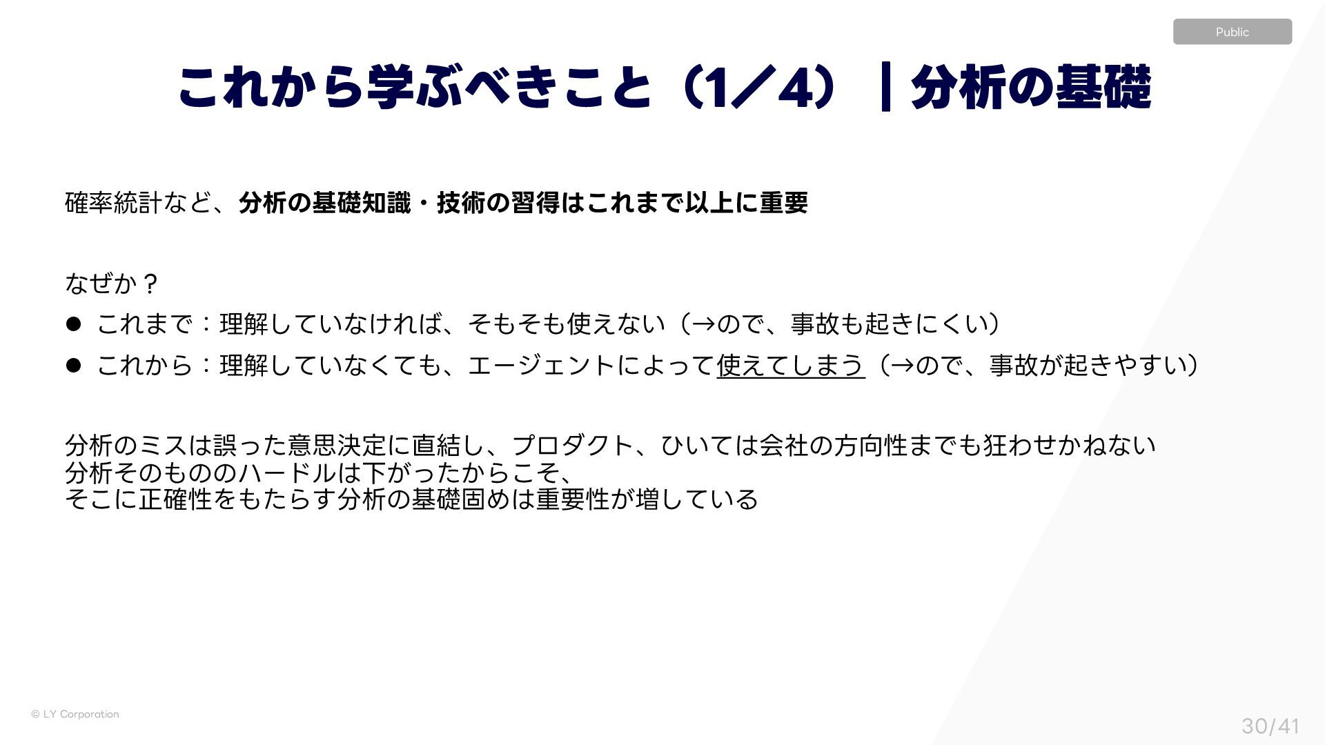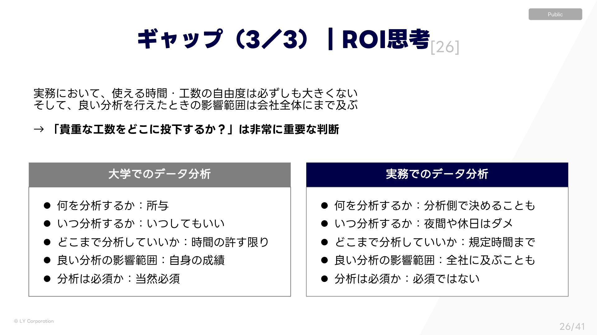 ੳͷӨڹൣғɿࣗͷ l ੳඞਢ͔ɿવඞਢ l ԿΛੳ͢Δ͔ɿੳଆͰܾΊΔ͜ͱ l ͍ͭੳ͢Δ͔ɿؒٳμϝ l Ͳ͜·Ͱੳ͍͍͔ͯ͠ɿنఆ࣌ؒ·Ͱ l ੳͷӨڹൣғɿશࣾʹٴͿ͜ͱ l ੳඞਢ͔ɿඞਢͰͳ͍ େֶͰͷσʔλੳ ࣮Ͱͷσʔλੳ Ϊϟοϓʢʗʣʛ30*ࢥߟ <> ࣮ʹ͓͍ͯɺ͑Δ࣌ؒɾͷࣗ༝ඞͣ͠େ͖͘ͳ͍ ͦͯ͠ɺੳͷӨڹձࣾશମʹ·ͰٴͿ ˠ ʮوॏͳΛͲ͜ʹԼ͢Δ͔ʁʯඇৗʹॏཁͳஅ