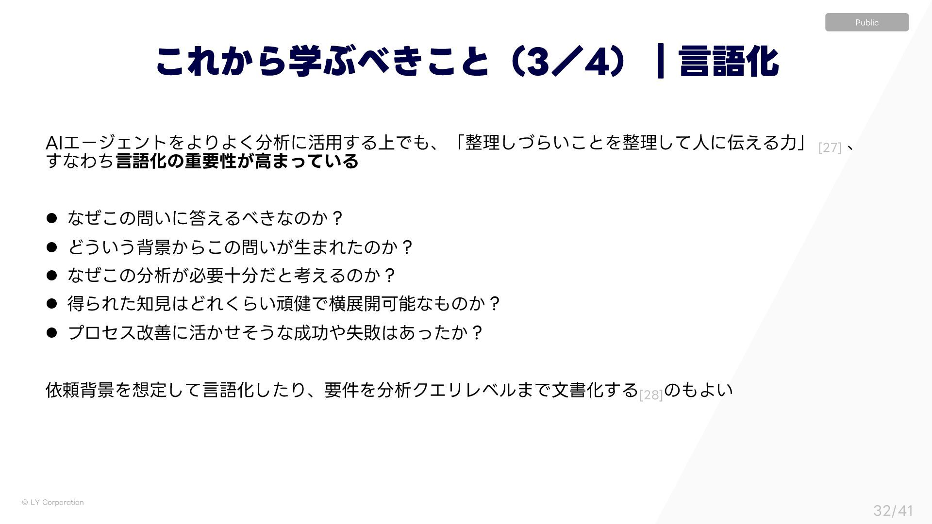 Ͳ͏͍͏എܠ͔Β͜ͷ͍͕ੜ·Εͨͷ͔ʁ l ͳͥ͜ͷੳ͕ඞཁेͩͱߟ͑Δͷ͔ʁ l ಘΒΕͨݟͲΕ͘Β͍ؤ݈Ͱԣల։Մೳͳͷ͔ʁ l ϓϩηεվળʹ׆͔ͤͦ͏ͳޭࣦഊ͔͋ͬͨʁ ґཔഎܠΛఆͯ͠ݴޠԽͨ͠Γɺཁ݅ΛੳΫΤϦϨϕϧ·ͰจॻԽ͢Δ<> ͷΑ͍ ͜Ε͔ΒֶͿ͖͜ͱʢʗʣʛݴޠԽ