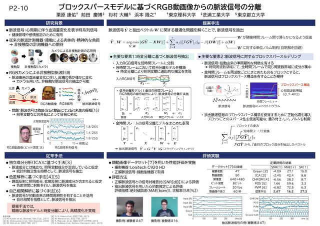 ‡芝浦工業大学 §東京都立大学 研究背景 提案手法 被験者数 47 動画像数 50 解像度 640×480 ビット深度 8ビット フレームレート 30 fps 動画像の長さ 60 秒 データセット[7]の詳細 撮影例:被験者#47 カメラによる非接触計測の応用例 非接触型(カメラ) 接触型 P2-10 参考文献 [1] M. Kumar et al., Biomed. Opt. Exp., 2015 [2] W. Verkruysse et al., Opt. Express, 2008 [3] M. Poh et al., IEEE TBE, 2011 SNR(↑) MAE(↓) SR(↑) Green [2] -4.09 27.1 15.0 ICA [3] -2.45 42.4 8.8 CHROM [4] -6.56 38.2 8.7 POS [5] 1.66 59.6 3.3 PVM [6] -6.82 72.5 6.3 提案手法 2.67 16.2 27.3 従来手法 脈波信号:心周期に伴う血液量変化を表す時系列信号 • 健康管理や感情推定のために有用 従来の脈波計測機器:接触による肉体的・精神的な負担 ➔ 非接触型の計測機器への期待 RGBカメラによる非接触型脈波計測 • 脈波由来の血液量変化に伴い,皮膚の色が僅かに変化 ➔ カメラを用いた,非接触な脈波信号の抽出が可能 • 問題:脈波信号は微弱(8bit動画にて2bit未満の振幅[1]) → 照明変動などの外乱によって容易に劣化 独立成分分析(ICA)に基づく手法[3] • 脈波成分とは独立な,照明変動成分が混合していると仮定 ➔ 統計的独立性を指標として,脈波信号を抽出 色差解析に基づく手法[4][5] • 鏡面反射に照明成分,拡散反射に脈波成分が含まれると仮定 ➔ 色差空間に射影を行い,脈波信号を抽出 自己相関解析に基づく手法[6] • 脈波信号が拍動由来の時間周期性を有することを活用 ➔ 自己相関を指標として,脈波信号を抽出 正解脈波信号 RGB動画像(ビット深度:8) RGB時系列信号 R 1.8/255 G 1.4/255 B 1.9/255 → 時間[s] 5 10 0 画素値 平均 抽出脈波信号 B 時間→ RGB信号 時間→ 信 号 処 理 RGB動画像 R G 血管 カメラ 光源 皮膚 脈波 主要な要素1:時変分離に基づく脈波信号抽出 • 入力RGB信号を短時間フレームに分割 • 各時間フレームにおいて信号分離モデルを構築 ➔ 時変分離により照明変動に適応的な抽出を実現 • 全時間フレームの信号分離モデルをまとめた表現 主要な要素2:脈波信号に対するブロックスパースモデリング • 脈波信号:拍動由来の準周期的な特徴を有する ➔ 時間周波数領域にて,全時間フレームで同じ周波数帯域に成分が集中 • 全時間フレームを周波数ごとにまとめたものをブロックとすると, 脈波信号はブロックスパース構造を有することが期待 心臓の 拍動 P R Q S T U ブロックスパース構造 脈波信号のスペクトログラム 時間フレーム 𝑡𝑡 → 周波数 𝑓𝑓 → 心拍周波数帯域 (0.7-4Hz) 脈波信号 • 信号分離モデル( 番目の時間フレーム) RGB信号の線形結合により,脈波信号の分離を実施 脈波 入力RGB 抽出ベクトル ノイズ ➔ 抽出脈波信号 • 抽出脈波信号のブロックスパース構造を促進するために正則化項を導入 - ブロックごとのスパース性を促進可能な,重み付き ノルムを利用 短時間フーリエ変換 ブロック の重み から, 番目のブロック成分を抽出したベクトル 顔動画像データセット[7]を用いた性能評価を実施 • 撮影機器:Logitech C920 HD • 正解脈波信号:接触型機器で取得 評価方法 • 正解脈波信号との信号対雑音比(SNR[dB])による評価 • 抽出脈波信号を用いた心拍数推定による評価 評価指標:絶対値誤差(MAE[bpm]),正解率(SR[%]) ( :スライディングウィンドウ) CHROM POS PVM Ours Ground truth 0 100 200 300 time [s] Input (R) Input (G) Input (B) Green ICA 0 100 200 300 time [s] 撮影例:被験者#16 定量評価の結果 入力RGB信号 脈波信号 と抽出ベクトル に関する最適化問題を解くことで,脈波信号を抽出 抽出脈波信号の例(被験者#47) 評価実験 に対する単位ノルム制約(自明解を回避) が隣接時間フレーム間で滑らかになるよう促進 [4] G. D. Haan et al., IEEE TBE, 2013 [5] W. Wang et al., IEEE TBE, 2017 [6] R. Macwan et al., IEEE/CVF CVPRW, 2018 [7] S. Bobbia et al., Pattern Recognit. Lett., 2019 提案手法では, 精緻な脈波モデルと時変分離により,高精度化を実現