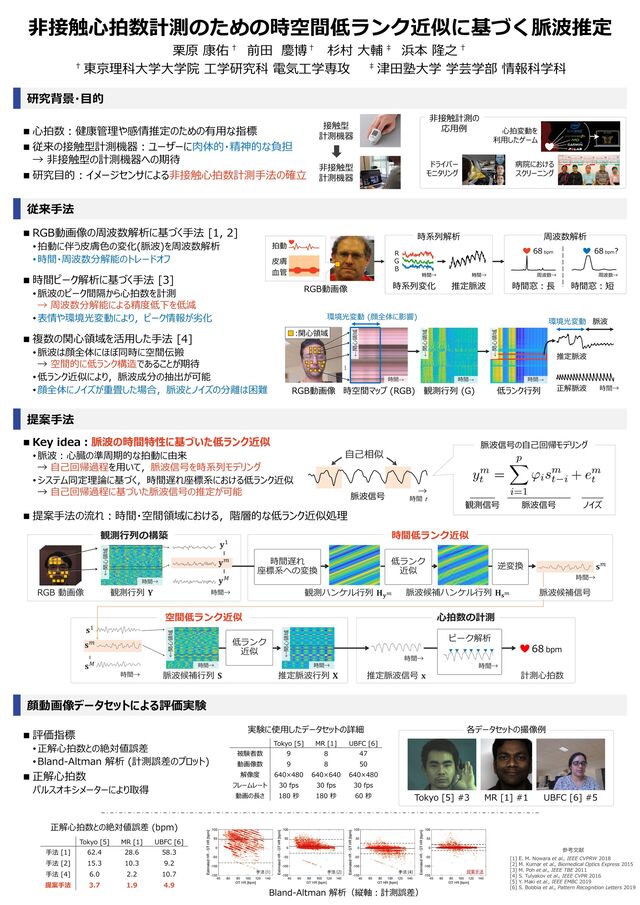 東京理科大学大学院 工学研究科 電気工学専攻 ‡ 津田塾大学 学芸学部 情報科学科 正解心拍数との絶対値誤差 (bpm) 参考文献 [1] E. M. Nowara et al., IEEE CVPRW 2018 [2] M. Kumar et al., Biomedical Optics Express 2015 [3] M. Poh et al., IEEE TBE 2011 [4] S. Tulyakov et al., IEEE CVPR 2016 [5] Y. Maki et al., IEEE EMBC 2019 [6] S. Bobbia et al., Pattern Recognition Letters 2019 ◼ RGB動画像の周波数解析に基づく手法 [1, 2] •拍動に伴う皮膚色の変化(脈波)を周波数解析 • 時間・周波数分解能のトレードオフ ◼ 時間ピーク解析に基づく手法 [3] • 脈波のピーク間隔から心拍数を計測 → 周波数分解能による精度低下を低減 • 表情や環境光変動により,ピーク情報が劣化 ◼ 複数の関心領域を活用した手法 [4] • 脈波は顔全体にほぼ同時に空間伝搬 → 空間的に低ランク構造であることが期待 • 低ランク近似により,脈波成分の抽出が可能 • 顔全体にノイズが重畳した場合,脈波とノイズの分離は困難 研究背景・目的 従来手法 顔動画像データセットによる評価実験 ◼ 評価指標 • 正解心拍数との絶対値誤差 • Bland-Altman 解析 (計測誤差のプロット) ◼ 正解心拍数 パルスオキシメーターにより取得 Tokyo [5] MR [1] UBFC [6] 被験者数 9 8 47 動画像数 9 8 50 解像度 640×480 640×640 640×480 フレームレート 30 fps 30 fps 30 fps 動画の長さ 180 秒 180 秒 60 秒 実験に使用したデータセットの詳細 Tokyo [5] MR [1] UBFC [6] 手法 [1] 62.4 28.6 58.3 手法 [2] 15.3 10.3 9.2 手法 [4] 6.0 2.2 10.7 提案手法 3.7 1.9 4.9 提案手法 ◼ Key idea:脈波の時間特性に基づいた低ランク近似 • 脈波:心臓の準周期的な拍動に由来 → 自己回帰過程を用いて,脈波信号を時系列モデリング • システム同定理論に基づく,時間遅れ座標系における低ランク近似 → 自己回帰過程に基づいた脈波信号の推定が可能 ◼ 提案手法の流れ:時間・空間領域における,階層的な低ランク近似処理 Bland-Altman 解析(縦軸:計測誤差) ◼ 心拍数:健康管理や感情推定のための有用な指標 ◼ 従来の接触型計測機器:ユーザーに肉体的・精神的な負担 → 非接触型の計測機器への期待 ◼ 研究目的:イメージセンサによる非接触心拍数計測手法の確立 観測信号 脈波信号 ノイズ 脈波信号の自己回帰モデリング 自己相似 → 時間 t 脈波信号 推定脈波 R G B 時間→ 時系列変化 時間→ 時系列解析 RGB動画像 周波数解析 周波数→ 68 bpm 時間窓:長 周波数→ 時間窓:短 68 bpm ? 非接触型 計測機器 接触型 計測機器 心拍変動を 利用したゲーム 病院における スクリーニング ドライバー モニタリング 非接触計測の 応用例 UBFC [6] #5 Tokyo [5] #3 MR [1] #1 各データセットの撮像例 血管 皮膚 拍動 RGB 動画像 観測行列 𝐘 ←関心領域 時間→ 時間→ 𝐲1 ⁞ 𝐲𝑚 ⁞ 𝐲𝑀 観測行列の構築 観測ハンケル行列 𝐇𝐲𝑚 𝐬𝑚 時間低ランク近似 時間遅れ 座標系への変換 逆変換 脈波候補ハンケル行列 𝐇𝐬𝑚 低ランク 近似 時間→ 空間低ランク近似 脈波候補行列 𝐒 推定脈波行列 𝐗 推定脈波信号 𝐱 計測心拍数 時間→ ←関心領域 時間→ ←関心領域 時間→ 低ランク 近似 心拍数の計測 ピーク解析 時間→ 68 bpm 時間→ 𝐬1 𝐬𝑚 ⁞ 𝐬𝑀 脈波候補信号 RGB動画像 正解脈波 時空間マップ (RGB) 観測行列 (G) :関心領域 時間→ ←関心領域 時間→ ←関心領域 … 低ランク行列 時間→ ←関心領域 環境光変動 (顔全体に影響) 環境光変動 時間→ 脈波 推定脈波