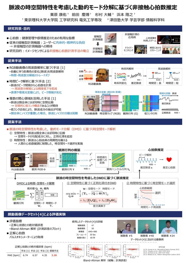 東京理科大学大学院 工学研究科 電気工学専攻 ‡ 津田塾大学 学芸学部 情報科学科 参考文献 [1] M. Kumar et al., Biomedical Optics Express 2015 [2] S. Tulyakov et al., IEEE CVPR 2016 [3] K. Kurihara et al., IEEE VCIP 2022 [4] S. Bobbia et al., Pattern Recognition Letters 2019 ◼ RGB動画像の周波数解析に基づく手法 [1] •拍動に伴う皮膚色の変化(脈波)を周波数解析 • 時間・周波数分解能のトレードオフ ◼ 時間ピーク解析に基づく手法 [2] • 脈波のピーク間隔から心拍数を計測 → 周波数分解能による精度低下を低減 • 表情や環境光変動により,ピーク情報が劣化 ◼ 複数の関心領域を活用した手法 [1] • 脈波は顔全体にほぼ同時に空間伝搬 → 空間的に低ランク構造であることが期待 • 低ランク近似により,脈波成分の抽出が可能 • 顔全体にノイズが重畳した場合,脈波とノイズの分離は困難 研究背景・目的 従来手法 顔動画像データセット[4]による評価実験 ◼ 評価指標 • 正解心拍数との絶対値誤差 • Bland-Altman 解析 (計測誤差のプロット) ◼ 正解心拍数 パルスオキシメーターにより取得 被験者数 47 動画像数 50 解像度 640×480 フレームレート 30 fps 動画の長さ 60 秒 使用したデータセット[4]の詳細 手法 [1] 手法 [2] 手法 [3] 提案手法 MAE [bpm] 6.74 6.57 4.35 3.28 Bland-Altman 解析(縦軸:計測誤差) ◼ 心拍数:健康管理や感情推定のための有用な指標 ◼ 従来の接触型計測機器:ユーザーに肉体的・精神的な負担 → 非接触型の計測機器への期待 ◼ 研究目的:イメージセンサによる非接触心拍数計測手法の確立 推定脈波 R G B 時間→ 時系列変化 時間→ 時系列解析 RGB動画像 周波数解析 周波数→ 68 bpm 時間窓:長 周波数→ 時間窓:短 68 bpm ? 非接触型 計測機器 接触型 計測機器 心拍変動を 利用したゲーム 病院における スクリーニング ドライバー モニタリング 非接触計測の 応用例 血管 皮膚 拍動 RGB動画像 正解脈波 時空間マップ (RGB) 観測行列 (G) :関心領域 時間→ ←関心領域 時間→ ←関心領域 … 低ランク行列 時間→ ←関心領域 環境光変動 (顔全体に影響) 環境光変動 時間→ 脈波 推定脈波 正解心拍数との絶対値誤差 (bpm) データセット[4]に含まれる撮像例 被験者 #5 被験者 #24 被験者 #40 提案手法 ◼ 脈波の時空間特性を考慮した,動的モード分解(DMD)に基づく時空間モード解析 ① 空間特性:脈波は顔全体にほぼ同時に伝搬 → 空間モードの勾配成分に対し,正則化項を追加 ② 時間特性:脈波は心拍由来の周期性を備える → 人間の心拍数範囲に制限した,時空間モード選択を実施 心拍数推定 脈波の時空間特性を考慮したDMDに基づく脈波推定 ② 時間特性に基づく時空間モード選択 時間モード周波数 強度 心拍数範囲 選択 DMDによる時間・空間モード展開 観測行列 ← 空間 時間 → 偏角 ← 空間 時間モード 時間 → ← 空間 空間モード 絶対値 ① 空間特性に基づく正則化項付きDMD :空間モード 時間モード 差分演算子 推定脈波 𝐱 時間 → ピーク解析 推定心拍数 観測行列の構築 RGB動画像 𝐲1 ⁞ 𝐲𝑚 ⁞ 𝐲𝑀 色差 解析 観測 RGB 𝐎 ←関心領域 時間→ 時間→ 観測行列 𝐘 ←関心領域 時間→ 時間遅れ 座標への 変換 観測ハンケル行列 𝐘𝐡