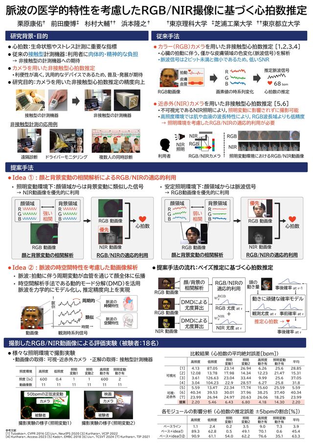画素値の時系列変化 R G B 心拍数の推定 血管 皮膚 拍動 68 bpm 推定脈波信号 心拍数:生命状態やストレス計測に重要な指標 従来の接触型計測機器:利用者に肉体的・精神的な負担 → 非接触型の計測機器への期待 カメラを用いた非接触型心拍数推定 •利便性が高く,汎用的なデバイスであるため,普及・発展が期待 研究目的:カメラを用いた非接触型心拍数推定の精度向上 カラー(RGB)カメラを用いた非接触型心拍数推定 [1,2,3,4] • 心臓の拍動に伴う,僅かな皮膚領域の色変化(脈波信号)を解析 • 脈波信号は2ビット未満と微小であるため,低いSNR 接触型の計測機器 非接触型の計測機器 複数人の同時診断 非接触型計測の応用例 研究背景・目的 従来手法 近赤外(NIR)カメラを用いた非接触型心拍数推定 [5,6] • 不可視光であるNIR照明により,照明変動に影響されずに撮影可能 • 高照度環境では肌や血液の波長特性により,RGB波長域よりも低精度 → 照明環境を考慮したRGB/NIRの適応的利用が必要 Idea ① : 顔と背景変動の相関解析によるRGB/NIRの適応的利用 • 照明変動環境下:顔領域からは背景変動に類似した信号 → NIR動画像を優先的に利用 • 安定照明環境下:顔領域からは脈波信号 → RGB動画像を優先的に利用 Idea ② : 脈波の時空間特性を考慮した動画像解析 • 脈波:拍動に伴う周期変動が血管を通じて顔全体に伝播 • 時空間解析手法である動的モード分解(DMD)を活用 脈波を力学的にモデル化し,推定精度向上を実現 撮影したRGB/NIR動画像による評価実験 (被験者:18名) 提案手法の流れ:ベイズ推定に基づく心拍数推定 RGB/NIRの適応的利用 R G B 顔領域 R G B 背景領域 強い 相関 顔と背景変動の相関解析 RGB 動画像 心拍数 RGB 動画像 NIR 動画像 優先 R G B 顔領域 R G B 背景領域 RGB 動画像 弱い 相関 顔と背景変動の相関解析 RGB/NIRの適応的利用 心拍数 RGB 動画像 優先 NIR 動画像 RGB NIR NIR 照明 動画像 類似 観測時系列信号 時間 空間 脈波の 空間特性 脈波の 時間特性 周期的 高照度 低照度 照明 変動1 照明 変動2 高照度 動き有 照明変動 動き有 平均 可視光 [1] 4.13 87.05 23.14 26.94 6.26 25.6 28.85 [2] 12.08 13.78 17.98 14.34 12.23 21.47 15.31 [3] 3.61 126.63 23.04 33.44 9.99 25.6 37.05 [4] 3.04 104.23 22.9 28.57 6.27 25.8 31.8 可視・ 近赤外 [5] 5.59 13.47 22.34 17.74 15.60 25.59 5.59 [6] 40.34 39.53 30.01 37.96 38.25 37.40 40.34 [7] 23.99 26.94 24.97 20.63 26.06 18.25 23.99 提案 2.20 5.46 6.43 6.80 4.18 14.30 2.20 利用者 照明変動環境におけるRGB/NIR動画像 RGB NIR RGB/NIRカメラ ドライバーモニタリング RGB 動画像 RGB 動画像 RGB/NIRの 適応的利用 NIR 動画像 RGB 尤度 at 𝜏𝜏 DMDによる 尤度算出 顔/背景の 相関解析 DMDによる 尤度算出 NIR 尤度 at 𝜏𝜏 + 推定心拍数 → 事後確率 at 𝜏𝜏-1 事後確率 at 𝜏𝜏 頭の 動き量 動きに頑健な確率モデル 観測尤度 at 𝜏𝜏 事前確率 at 𝜏𝜏 様々な照明環境で撮影実験 ・動画像の取得: 可視・近赤外カメラ ・正解の取得: 接触型計測機器 遠隔診断 50bpmの正弦波変動 カメラ 被験者 撮影実験の様子(照明変動1) 映画 カメラ 被験者 撮影実験の様子(照明変動2) 比較結果 (心拍数の平均絶対誤差[bpm]) 照度環境 高照度 低照度 照明 変動1 照明 変動2 高照度 動き有 照明変動 動き有 照度 [lx] 600 0.4 1 1 600 2 動画像数 11 11 11 11 11 11 各モジュールの影響分析 (心拍数の推定誤差 ±5bpmの割合[%]) 参考文献 [1] Tulyakov+, CVPR 2016 [2] Liu+, NeurIPS 2020 [3] Kurihara+, VCIP 2022 [4] Kurihara+, Access 2023 [5] Kado+, EMBC 2018 [6] Liu+, TCSVT 2024 [7] Kurihara+, TIP 2021 高照度 低照度 照明 変動1 照明 変動2 高照度 動き有 照明変動 動き有 平均 ベースライン 1.1 2.4 0.2 3.5 9.0 7.3 3.9 ベース+idea① 89.3 62.8 0.5 49.1 70.1 0.6 45.4 ベース+idea①② 90.9 61.1 54.0 62.2 76.6 35.1 63.3