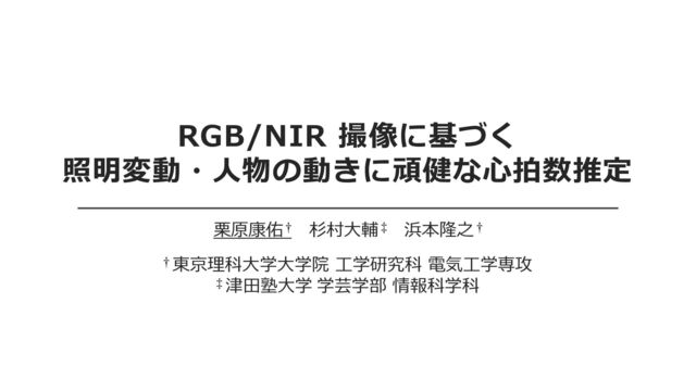 0.4 lx S3:照明変動1 1 lx S4:照明変動2 1 lx S5:高照度(動き有)600 lx ◼ 比較手法 ➢ RGB映像を用いた手法 [2] ➢ NIR映像を用いた手法 [5] ➢ RGB/NIR映像を用いた手法 [4] 撮影した映像による評価実験 22 心拍数と似た 変動を持つ映像 RGB/NIRカメラ 被験者 シーン”S3” 映画の予告編 RGB/NIRカメラ 被験者 シーン”S4“ [2] A. Lam et al., “Robust Heart Rate Measurement from Video Using Select Random Patches”, in IEEE ICCV 2015 [4] S. Kado et al., “Remote heart rate measurement from RGB-NIR video based on spatial and spectral face patch selection”, in IEEE EMBC 2018 [5] E.M.Nowara et al., “SparsePPG: Towards Driver Monitoring Using Camera-Based Vital Signs Estimation in Near-Infrared”, in IEEE CVPR-W 2018 シーン”S5“ 撮影例