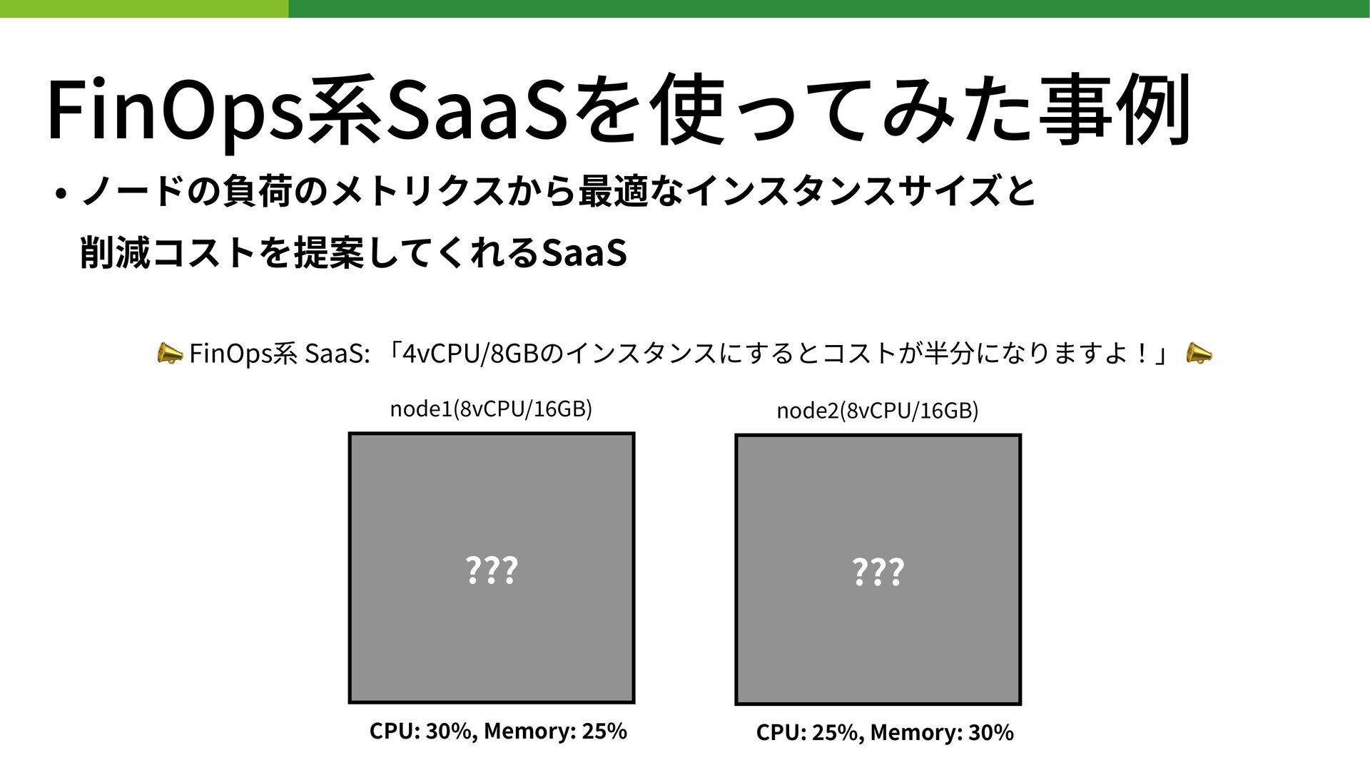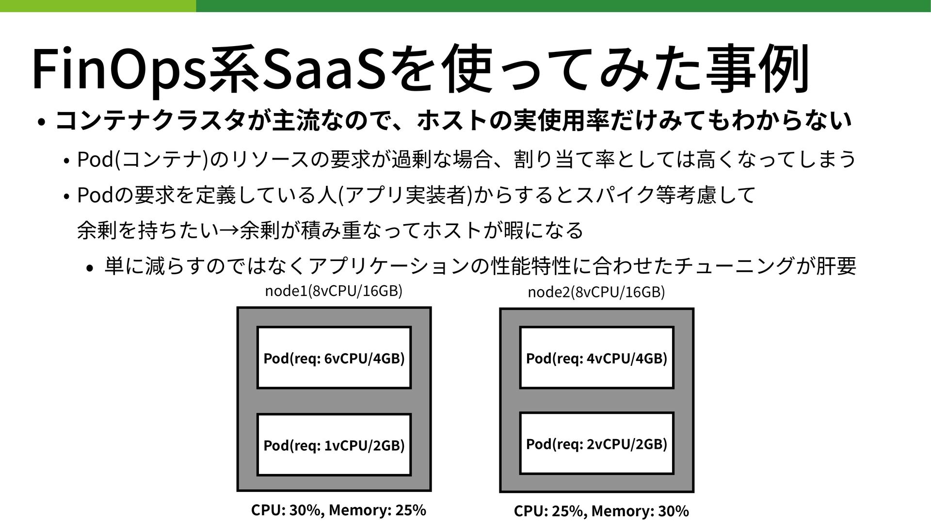Podの要求を定義している 人 (アプリ実装者)からするとスパイク等考慮して 余剰を持ちたい→余剰が積み重なってホストが暇になる • 単に減らすのではなくアプリケーションの性能特性に合わせたチューニングが肝要 CPU: 30 %, Memory: 25 % CPU: 25 %, Memory: 30 % node 1 ( 8 vCPU/ 1 6 GB) node 2 ( 8 vCPU/ 1 6 GB) Pod(req: 6 vCPU/ 4 GB) Pod(req: 1 vCPU/ 2 GB) Pod(req: 4 vCPU/ 4 GB) Pod(req: 2 vCPU/ 2 GB)