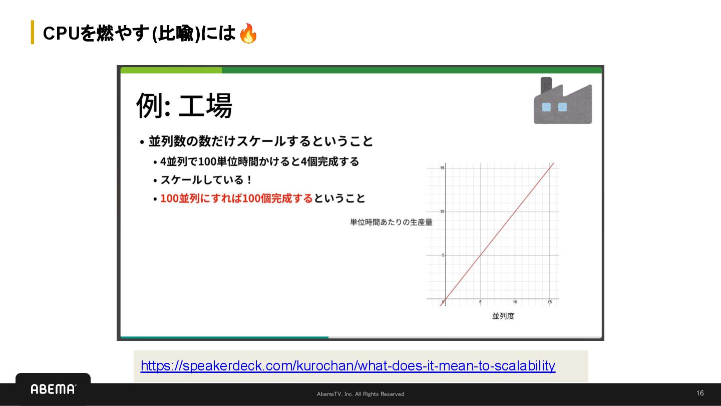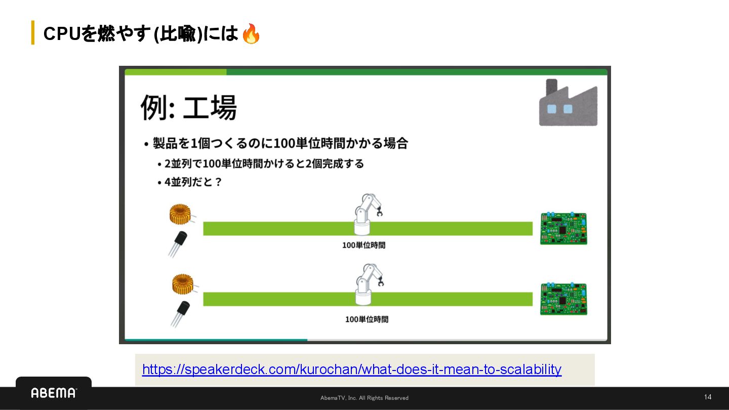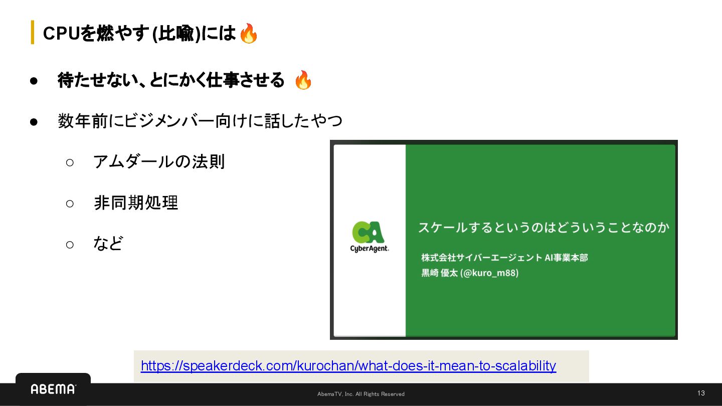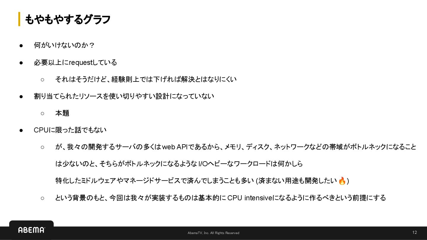 もやもやするグラフ 12 • 何がいけないのか? • 必要以上にrequestしている ◦ それはそうだけど、経験則上では下げれば解決とはなりにくい • 割り当てられたリソースを使い切りやすい設計になっていない ◦ 本題 • CPUに限った話でもない ◦ が、我々の開発するサーバの多くはweb APIであるから、メモリ、ディスク、ネットワークなどの帯域がボトルネックになること は少ないのと、そちらがボトルネックになるような I/Oヘビーなワークロードは何かしら 特化したミドルウェアやマネージドサービスで済んでしまうことも多い (済まない用途も開発したい🔥) ◦ という背景のもと、今回は我々が実装するものは基本的に CPU intensiveになるように作るべきという前提にする