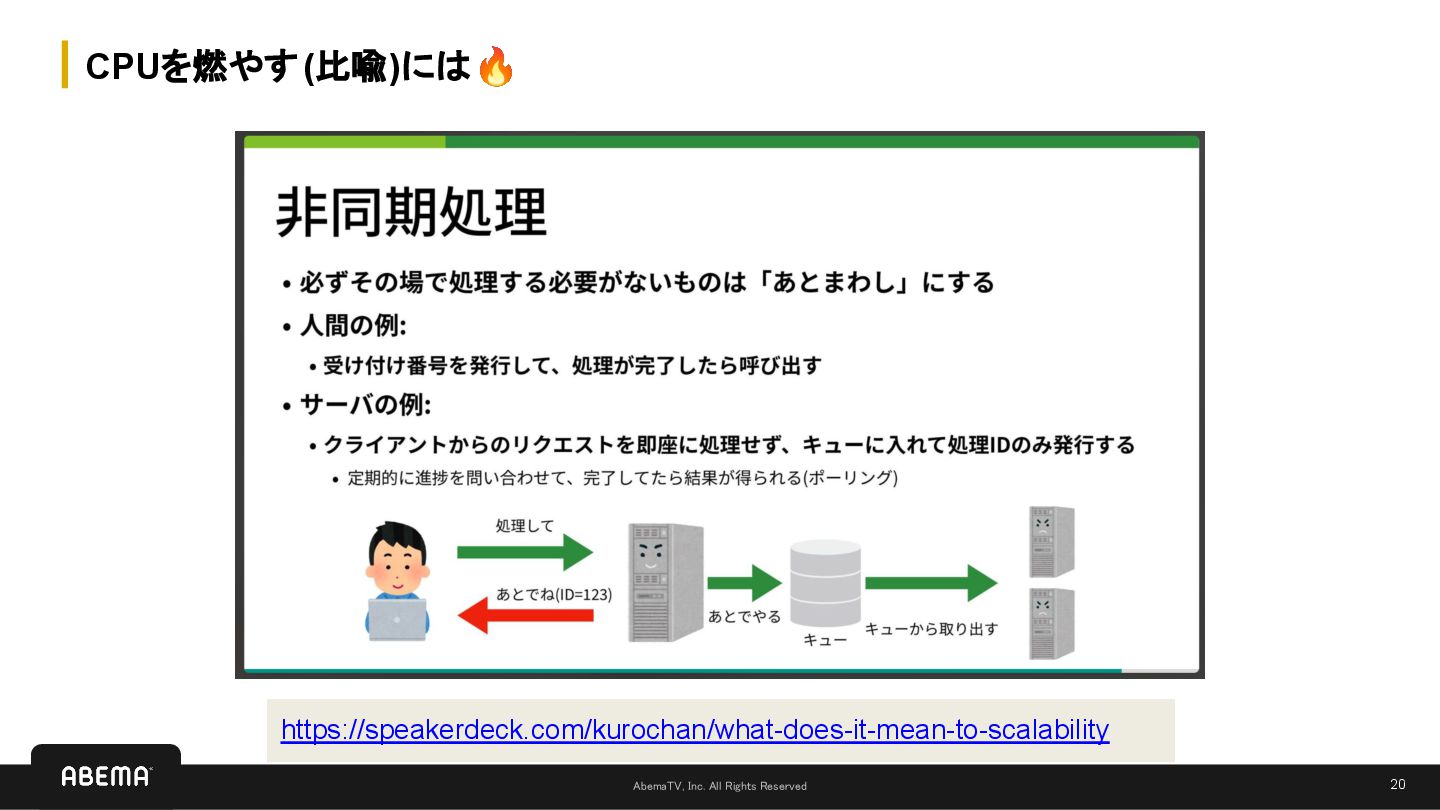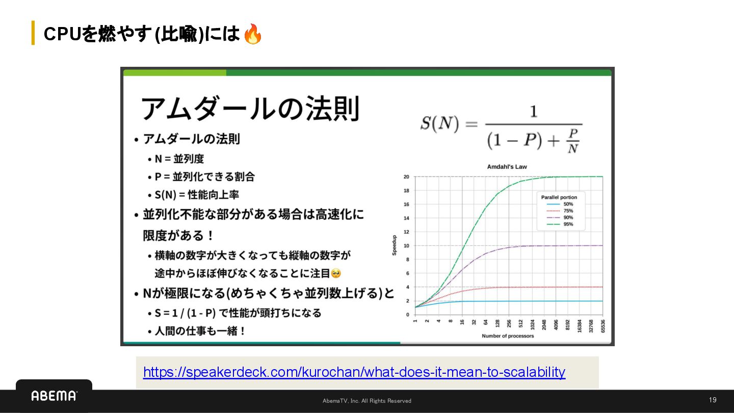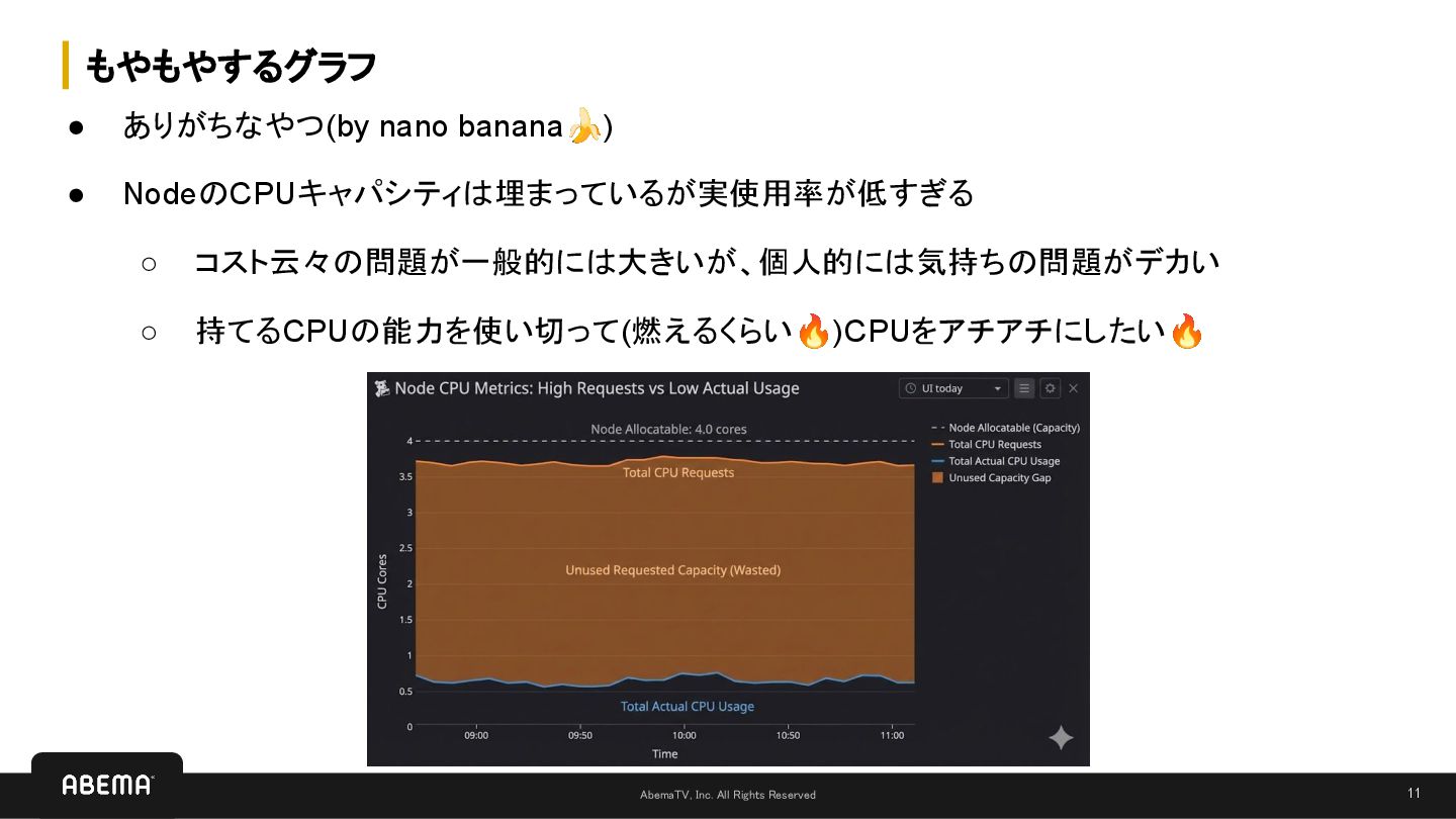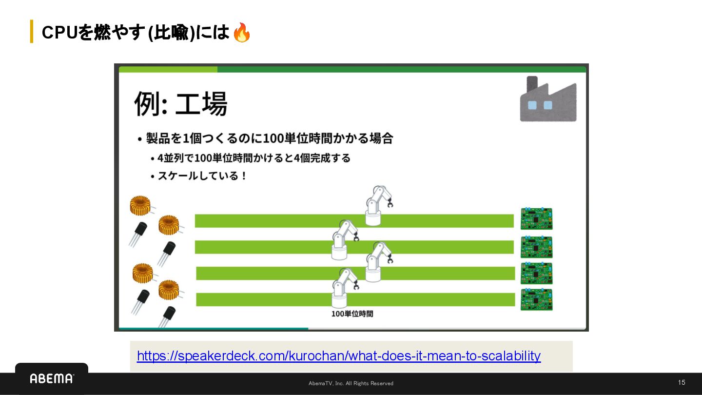 もやもやするグラフ 12 • 何がいけないのか? • 必要以上にrequestしている ◦ それはそうだけど、経験則上では下げれば解決とはなりにくい • 割り当てられたリソースを使い切りやすい設計になっていない ◦ 本題 • CPUに限った話でもない ◦ が、我々の開発するサーバの多くはweb APIであるから、メモリ、ディスク、ネットワークなどの帯域がボトルネックになること は少ないのと、そちらがボトルネックになるような I/Oヘビーなワークロードは何かしら 特化したミドルウェアやマネージドサービスで済んでしまうことも多い (済まない用途も開発したい🔥) ◦ という背景のもと、今回は我々が実装するものは基本的に CPU intensiveになるように作るべきという前提にする