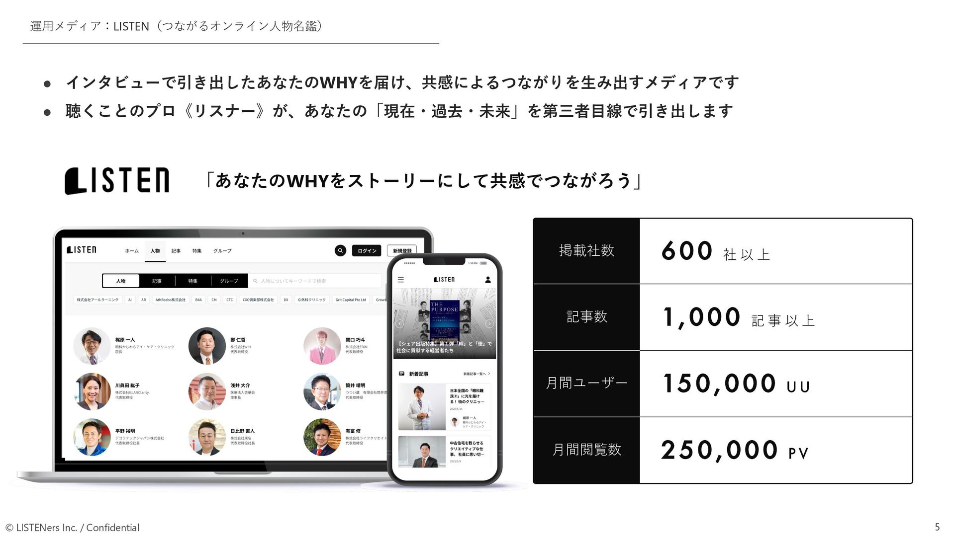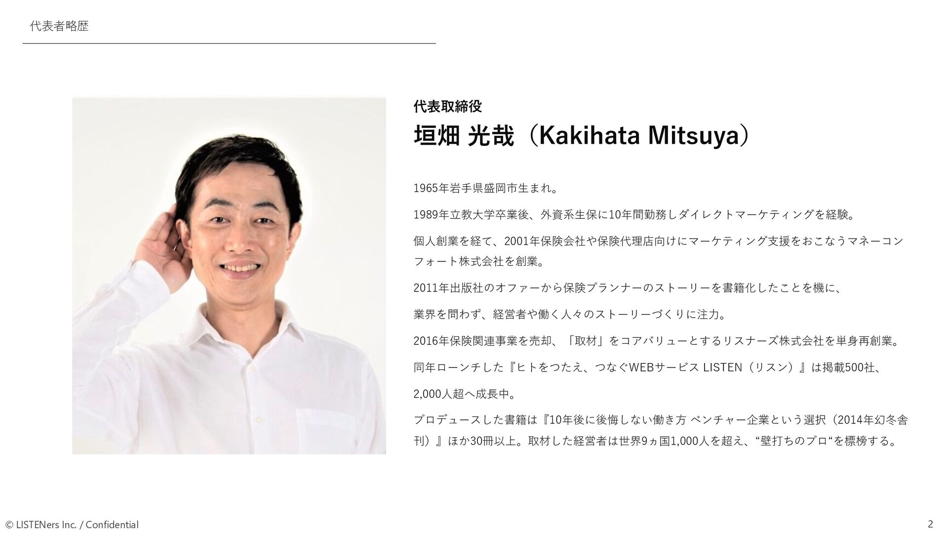 Mitsuya) 1965年岩⼿県盛岡市⽣まれ。 1989年⽴教⼤学卒業後、外資系⽣保に10年間勤務しダイレクトマーケティングを経験。 個⼈創業を経て、2001年保険会社や保険代理店向けにマーケティング⽀援をおこなうマネーコン フォート株式会社を創業。 2011年出版社のオファーから保険プランナーのストーリーを書籍化したことを機に、 業界を問わず、経営者や働く⼈々のストーリーづくりに注⼒。 2016年保険関連事業を売却、「取材」をコアバリューとするリスナーズ株式会社を単⾝再創業。 同年ローンチした『ヒトをつたえ、つなぐWEBサービス LISTEN(リスン)』は掲載500社、 2,000⼈超へ成⻑中。 プロデュースした書籍は『10年後に後悔しない働き⽅ ベンチャー企業という選択(2014年幻冬舎 刊)』ほか30冊以上。取材した経営者は世界9ヵ国1,000⼈を超え、“壁打ちのプロ“を標榜する。