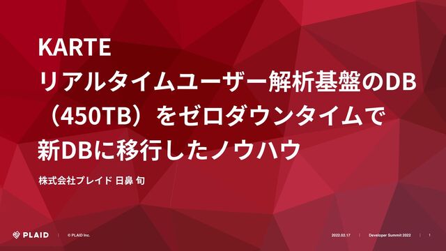1 KARTE リアルタイムユーザー解析基盤のDB (450TB)をゼロダウンタイムで 新DBに移⾏したノウハウ 株式会社プレイド ⽇⿐ 旬 ɹɹʛɹɹ© PLAID