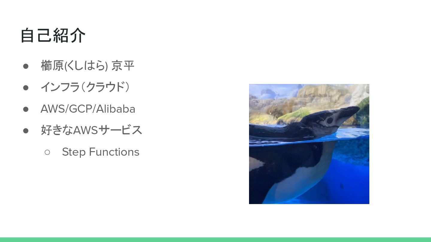 自己紹介 • 櫛原(くしはら) 京平 • インフラ(クラウド) • AWS/GCP/Alibaba • 好きなAWSサービス