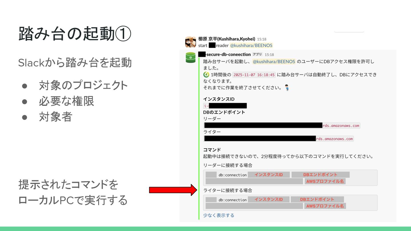 踏み台の起動① Slackから踏み台を起動 • 対象のプロジェクト • 必要な権限 • 対象者 提示されたコマンドを ローカルPCで実行する