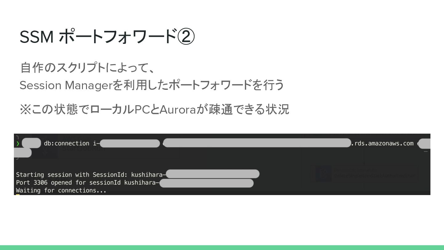 SSM ポートフォワード② 自作のスクリプトによって、 Session Managerを利用したポートフォワードを行う ※この状態でローカルPCとAuroraが疎通できる状況