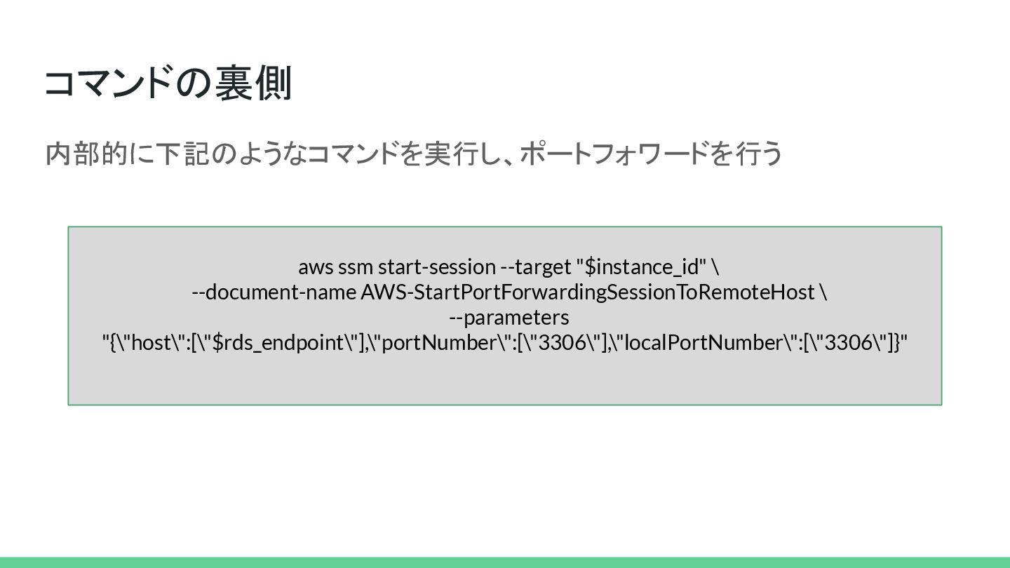 コマンドの裏側 内部的に下記のようなコマンドを実行し、ポートフォワードを行う aws ssm start-session --target "$instance_id" \ --document-name AWS-StartPortForwardingSessionToRemoteHost