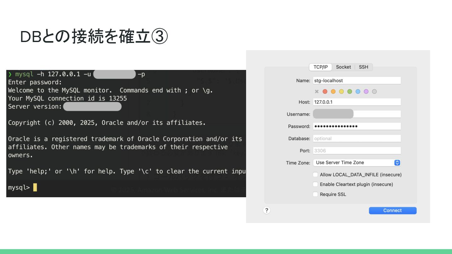 ローカル->DBへの接続、どうしてますか • DBへの接続経路は? ◦ SSH鍵を利用して踏み台サーバを経由して接続 ◦ Session Managerを利用して踏み台サーバを経由して接続 • DB接続方法は?