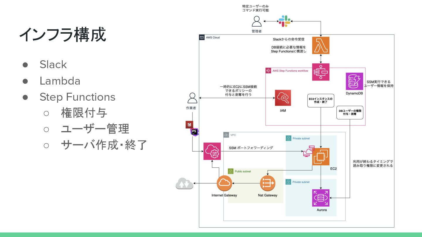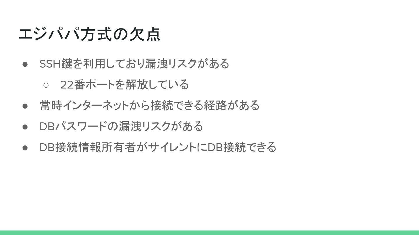 エジパパ方式の欠点 • SSH鍵を利用しており漏洩リスクがある ◦ 22番ポートを解放している • 常時インターネットから接続できる経路がある • DBパスワードの漏洩リスクがある •