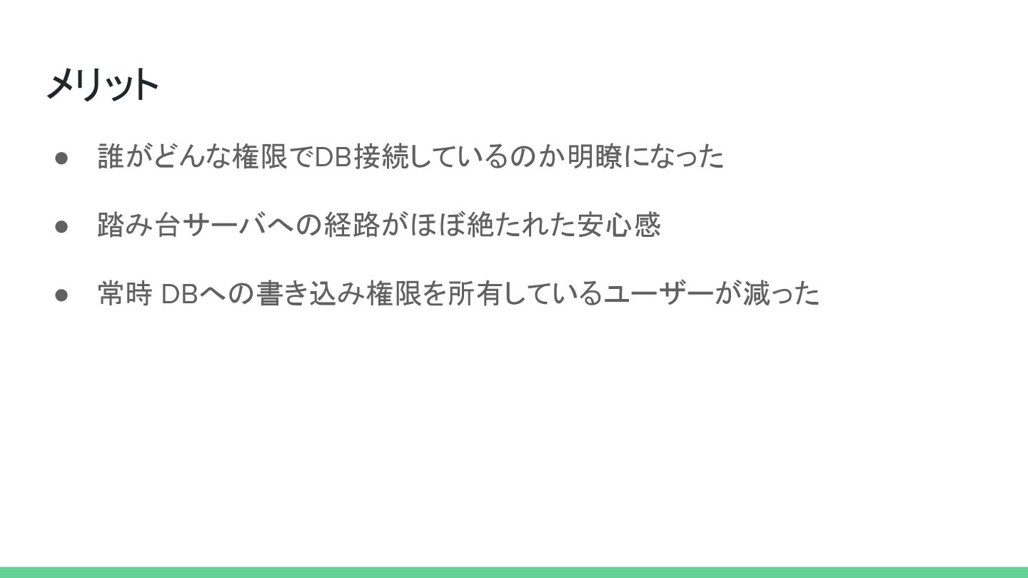 メリット • 誰がどんな権限でDB接続しているのか明瞭になった • 踏み台サーバへの経路がほぼ絶たれた安心感 • 常時 DBへの書き込み権限を所有しているユーザーが減った