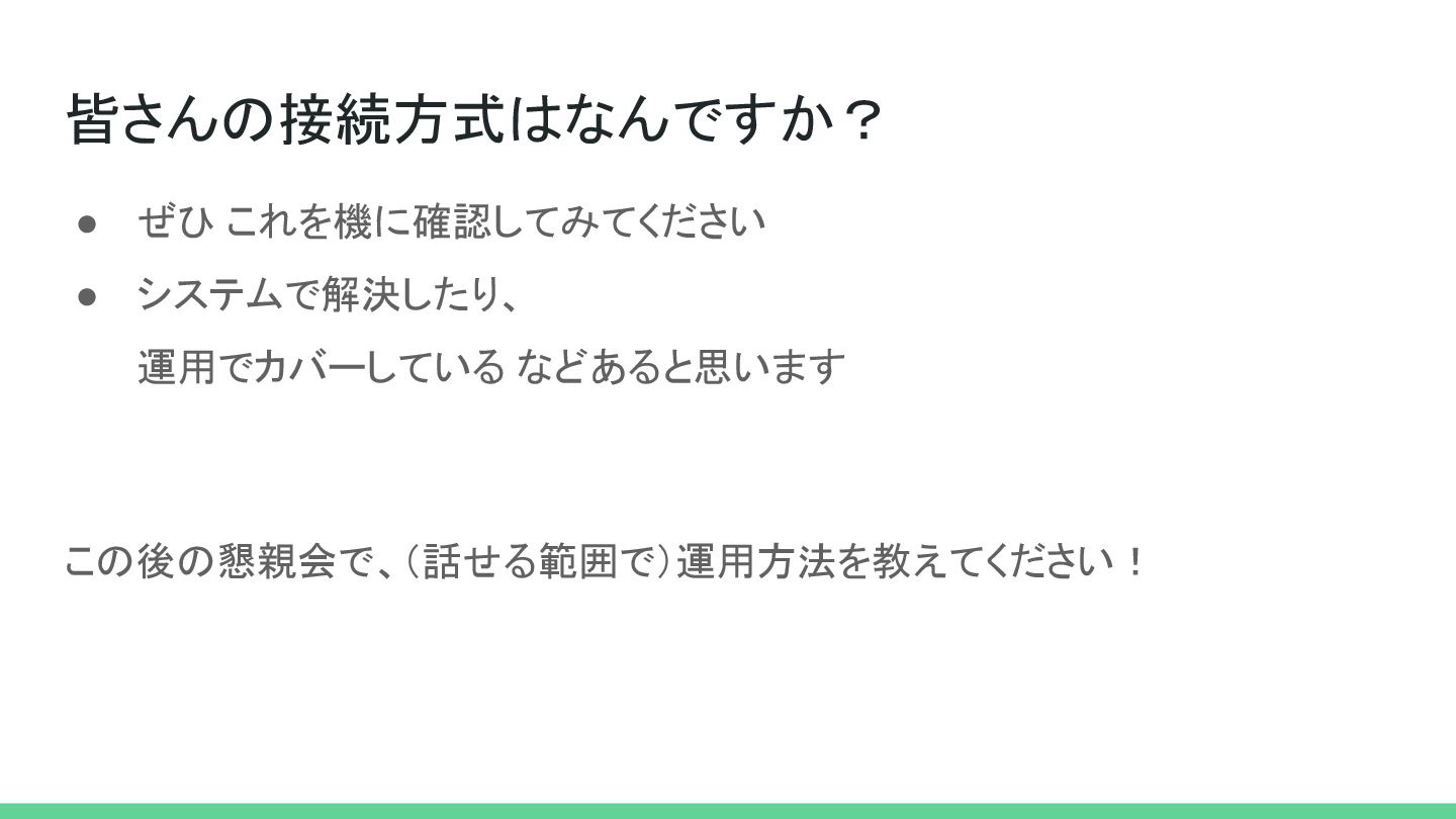 • ぜひ これを機に確認してみてください • システムで解決したり、 運用でカバーしている などあると思います この後の懇親会で、(話せる範囲で)運用方法を教えてください! 皆さんの接続方式はなんですか?