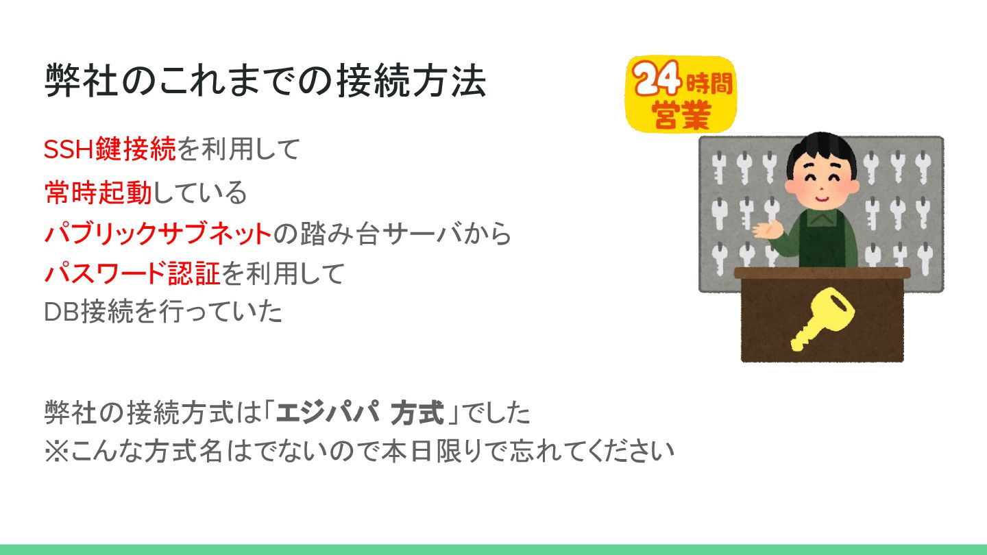 弊社のこれまでの接続方法 SSH鍵接続を利用して 弊社の接続方式は「エジパパ 方式」でした ※こんな方式名はでないので本日限りで忘れてください 常時起動している パブリックサブネットの踏み台サーバから パスワード認証を利用して DB接続を行っていた