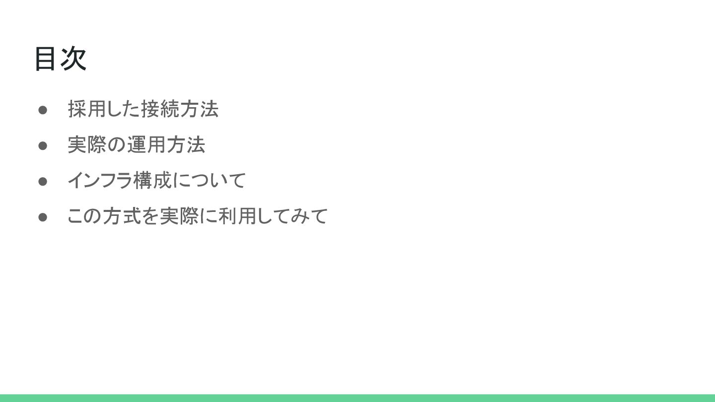 目次 • 採用した接続方法 • 実際の運用方法 • インフラ構成について • この方式を実際に利用してみて