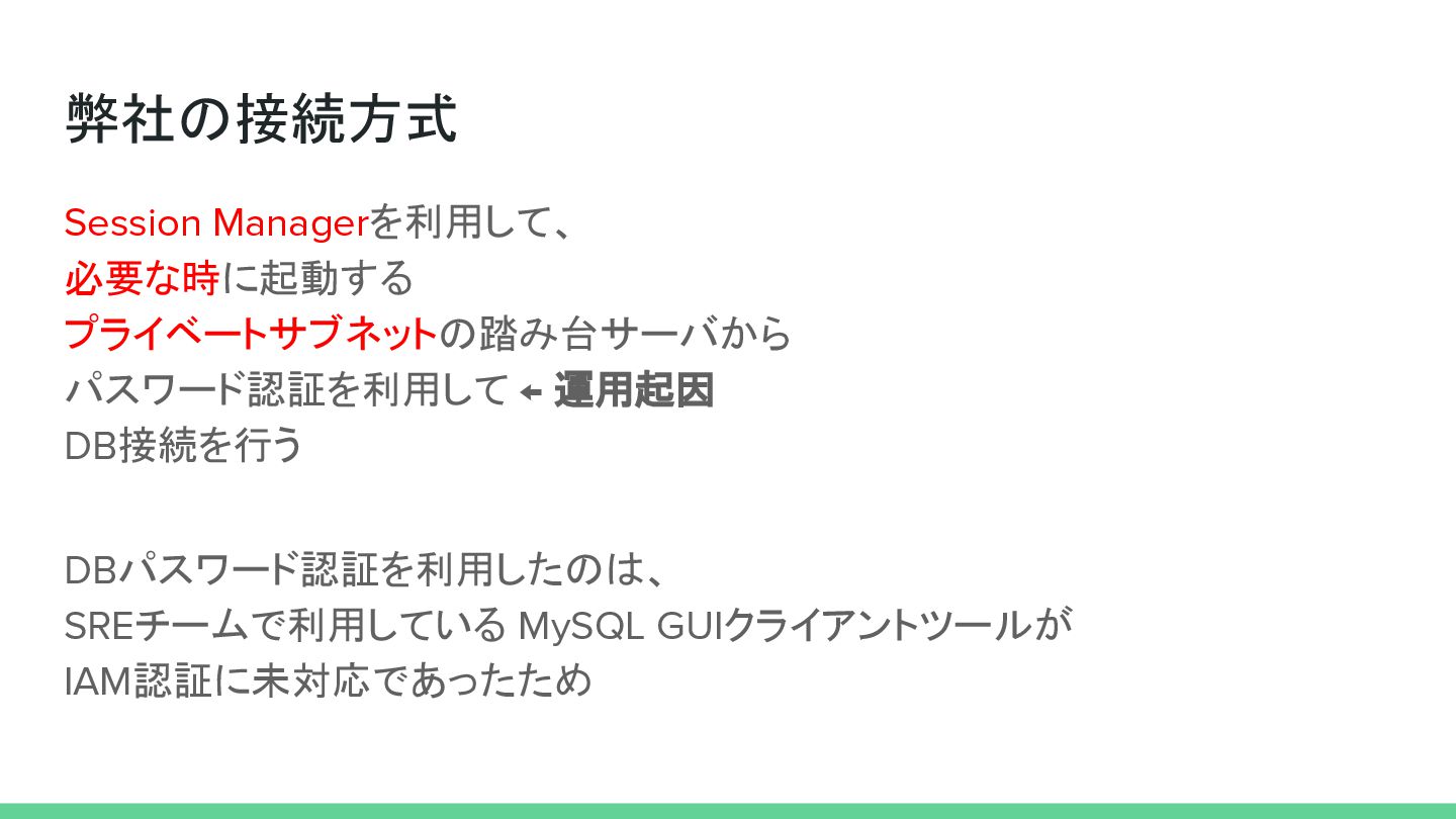 弊社の接続方式 Session Managerを利用して、 必要な時に起動する プライベートサブネットの踏み台サーバから パスワード認証を利用して ← 運用起因 DB接続を行う DBパスワード認証を利用したのは、