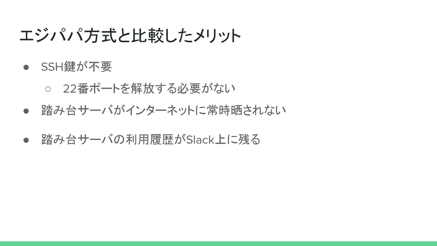 エジパパ方式と比較したメリット • SSH鍵が不要 ◦ 22番ポートを解放する必要がない • 踏み台サーバがインターネットに常時晒されない • 踏み台サーバの利用履歴がSlack上に残る