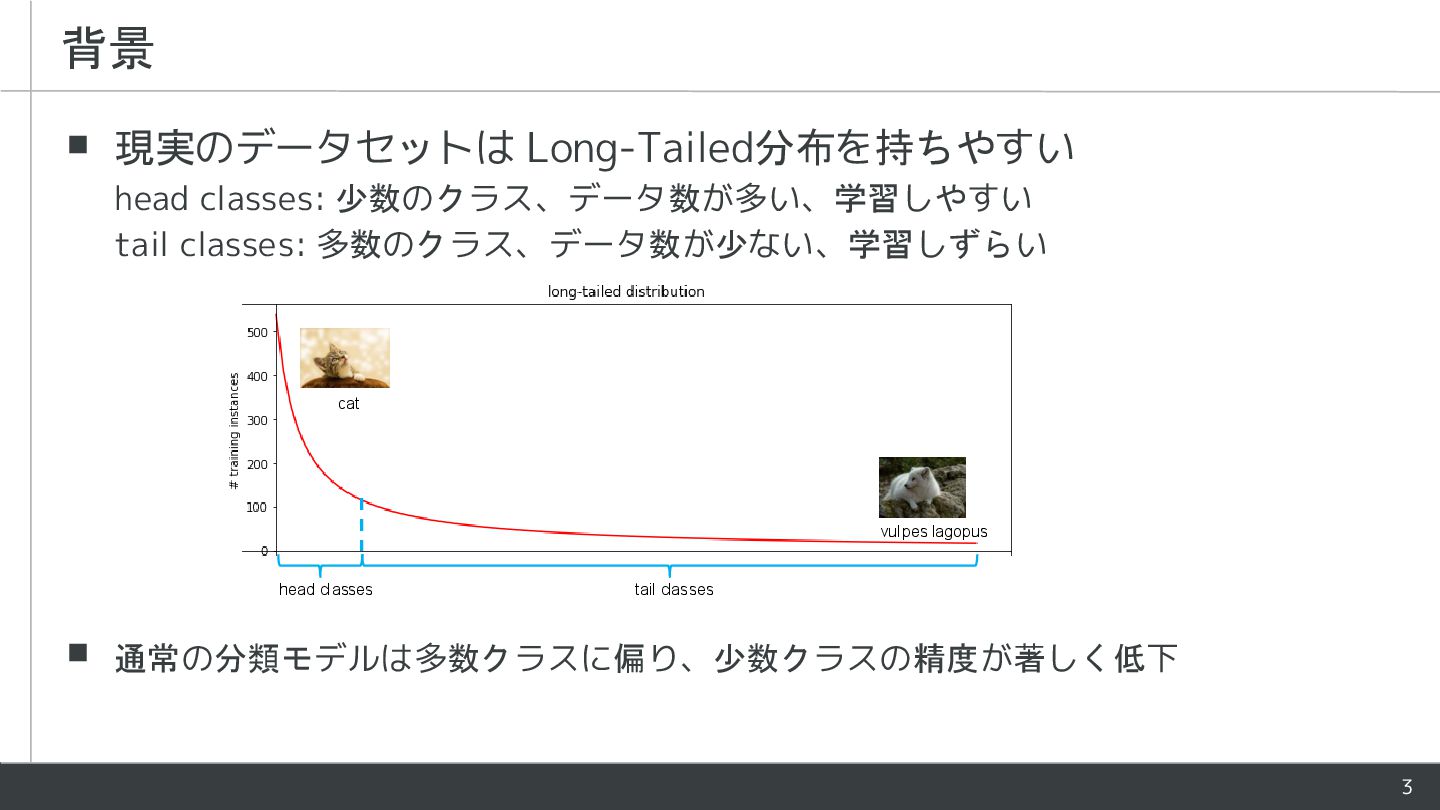 多数のクラス、データ数が少ない、学習しずらい ▪ 通常の分類モデルは多数クラスに偏り、少数クラスの精度が著しく低下 head classes tail classes cat vulpes lagopus