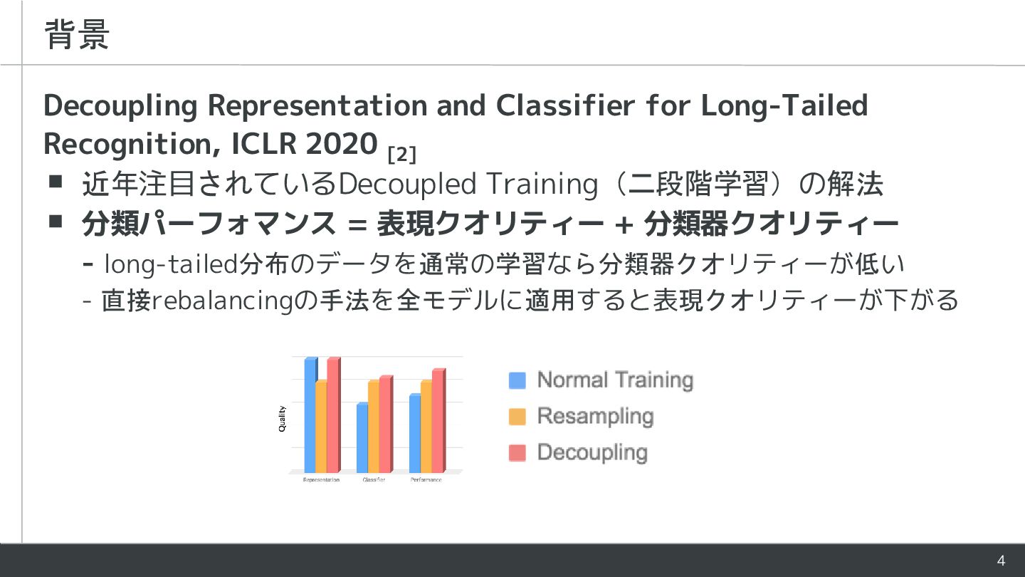 2020 [2] ▪ 近年注目されているDecoupled Training(二段階学習)の解法 ▪ 分類パーフォマンス = 表現クオリティー + 分類器クオリティー - long-tailed分布のデータを通常の学習なら分類器クオリティーが低い - 直接rebalancingの手法を全モデルに適用すると表現クオリティーが下がる