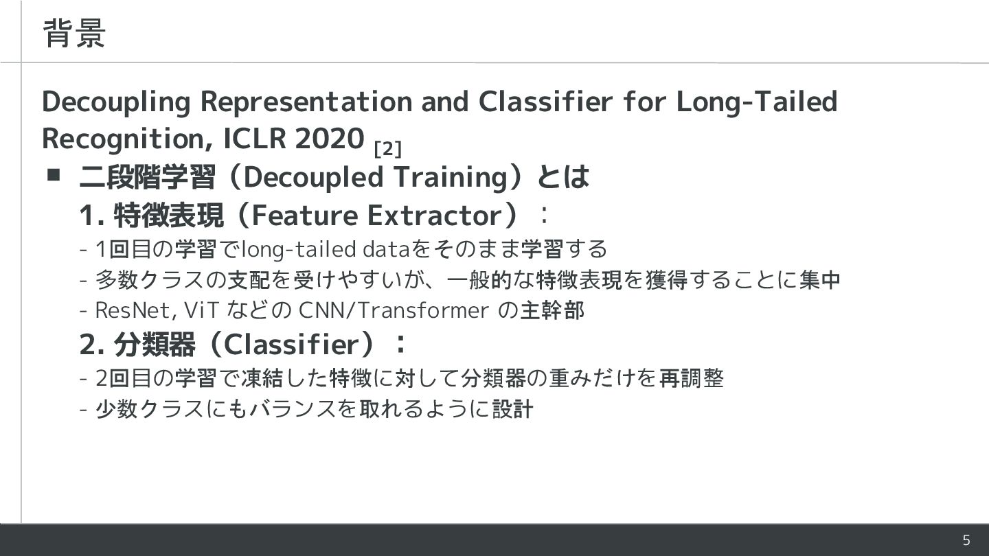 2020 [2] ▪ 二段階学習(Decoupled Training)とは 1. 特徴表現(Feature Extractor): - 1回目の学習でlong-tailed dataをそのまま学習する - 多数クラスの支配を受けやすいが、一般的な特徴表現を獲得することに集中 - ResNet, ViT などの CNN/Transformer の主幹部 2. 分類器(Classifier): - 2回目の学習で凍結した特徴に対して分類器の重みだけを再調整 - 少数クラスにもバランスを取れるように設計