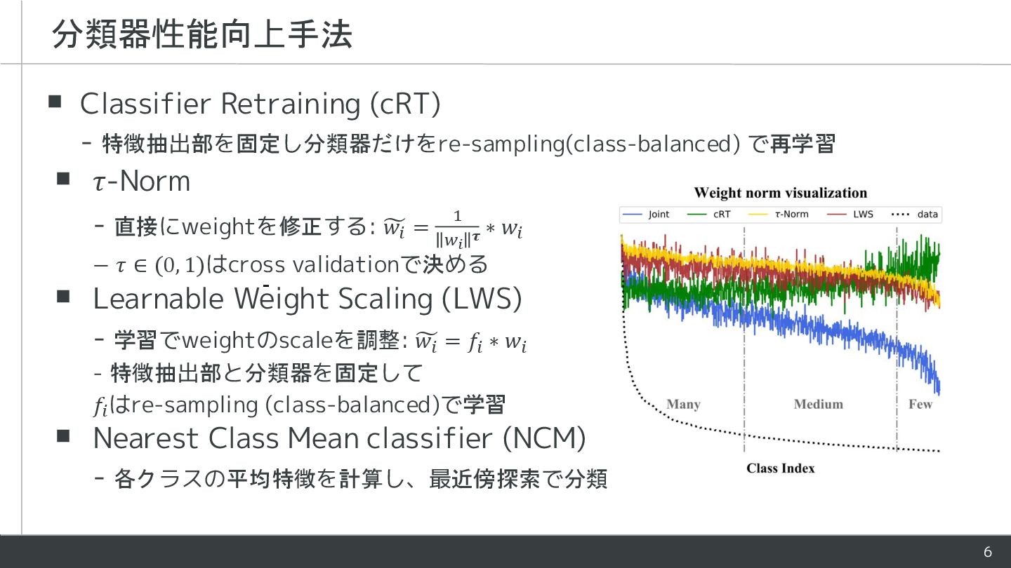 6 ▪ Classifier Retraining (cRT) - 特徴抽出部を固定し分類器だけをre-sampling(class-balanced) で再学習 ▪ 𝜏-Norm