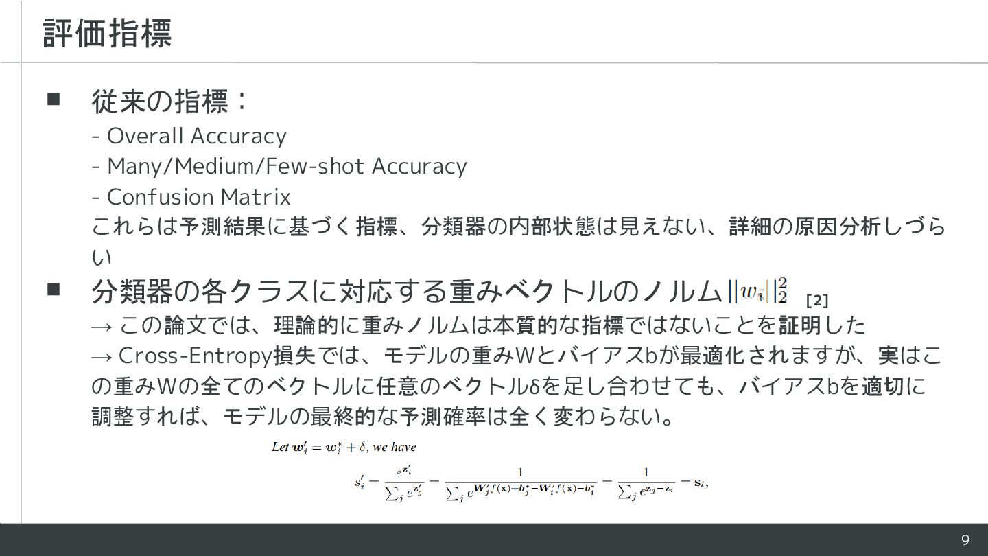 - Confusion Matrix これらは予測結果に基づく指標、分類器の内部状態は見えない、詳細の原因分析しづら い ▪ 分類器の各クラスに対応する重みベクトルのノルム [2] → この論文では、理論的に重みノルムは本質的な指標ではないことを証明した → Cross-Entropy損失では、モデルの重みWとバイアスbが最適化されますが、実はこ の重みWの全てのベクトルに任意のベクトルδを足し合わせても、バイアスbを適切に 調整すれば、モデルの最終的な予測確率は全く変わらない。