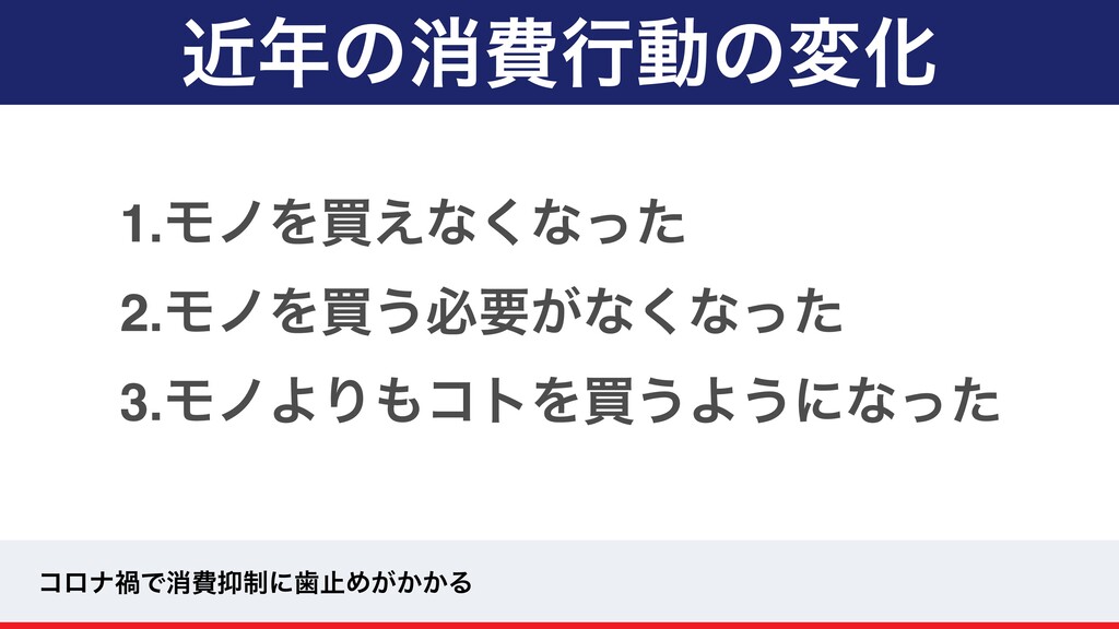 ۙͷফඅߦಈͷมԽ 1.ϞϊΛങ͑ͳ͘ͳͬͨ 2.ϞϊΛങ͏ඞཁ͕ͳ͘ͳͬͨ 3.ϞϊΑΓίτΛങ͏Α͏ʹͳͬͨ ίϩφՒͰফඅ੍ʹࣃࢭΊ͕͔͔Δ