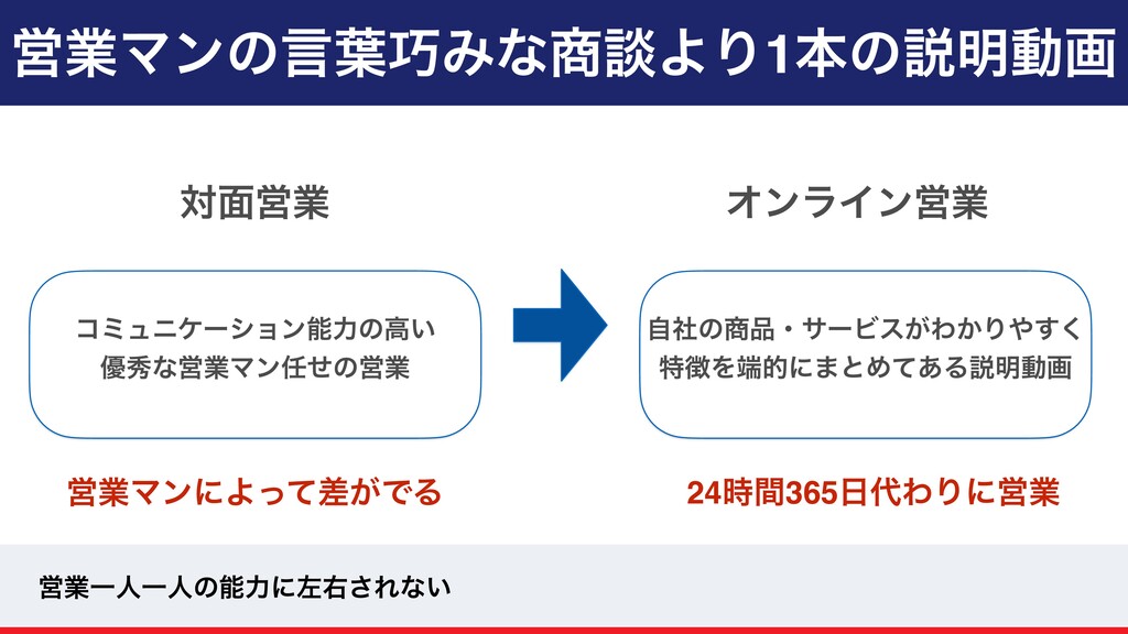 ӦۀϚϯͷݴ༿ΈͳஊΑΓ1ຊͷઆ໌ಈը ίϛϡχέʔγϣϯೳྗͷߴ͍ ༏लͳӦۀϚϯͤͷӦۀ ࣗࣾͷɾαʔϏε͕Θ͔Γ͘͢ ಛΛతʹ·ͱΊͯ͋Δઆ໌ಈը ର໘Ӧۀ ΦϯϥΠϯӦۀ ӦۀҰਓҰਓͷೳྗʹࠨӈ͞Εͳ͍ 24࣌ؒ365ΘΓʹӦۀ ӦۀϚϯʹΑ͕ͬͯࠩͰΔ