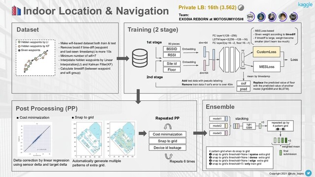 stage) Hidden waypoints by LI Hidden waypoints by KF - Make wifi-based dataset both train & test - Remove bssid if time-diff (waypoint and last-seen timestamp) is more 10s - Minimum number of wifi=7 - Interpolate hidden waypoints by Linear Interpolation(LI) and Kalman Filter(KF) - Calculate timediff (between waypoint and wifi group) BSSID RSSI Site id Floor Embedding Embedding xy floor CustomLoss MESLoss dim=64 dim=64 FC layer1(128→256) LSTM layer×2(256→128→16) FC layer2(xy:16→2, floor:16→1) 1st stage 2nd stage oof pred Add test data with pseudo labeling Remove train data if oof’s error is over 40m Loss - MSELoss-based - Given weight according to timediff - if timediff is large, weight become smaller (don’t learn too much) Ensemble Cost minimaization Snap to grid Device id leakage Repeats 6 times Repeated PP ▪ Snap to grid ▪ Cost minimaization 80 pieces Delta correction by linear regression using sensor delta and target delta Automatically generate multiple patterns of extra grid. mean by timestamp Team: EXODIA REBORN at MOTOSUMIYOSHI Given waypoints Replace the predicted value of floor with the predicted value of another model (lightGBM and BiLSTM). Copyright 2021 @kuto_bopro 4 pattern grid when do snap to grid ❶ snap to grid’s threshold=None / sparse extra grid ❷ snap to grid’s threshold=None / dense extra grid ❸ snap to grid’s threshold=None / edge extra grid ❹ snap to grid’s threshold=5 / only train grid model1 repeated pp by 4 pattern grid (❶〜❹) model2 model3 stacking light GBM final submission weighted mean ×3 ×3 Private LB: 16th (3.562)