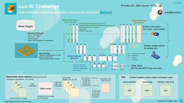 episodes ・Team: Toad Brigade ・LB score > 1900 ・only win game ・about 1000 episodes(3 submissions) Unet Imitation Learning approach inspired by nosound(@zharch) obs horizontal flip vertical flip random roll(-5~5) TTA obs obs Global features (8ch,4,4) Observation map (17ch, 32, 32) Policy map (3ch,32,32) ・Units counts (×2) ・Citytiles counts (×2) ・Research points (×2) ・turn / cycle Data Sampling ・Random sampling up to 4 units actions in each turn ・Downsampling center actions Extract units policy from each units position Image reference: https://www.lux-ai.org/ ・Units position/cooldown/resource (×2) ・Citytiles position/cooldown/fuel-lightupkeep ratio (×2) ・Wood/Coal/Uranium positions ・Road level ・Effective map area Create 8 pattern policy maps and apply mean UNet model Decide citytile actions by simple rule Create 4 batch by rotation input (4 batches) Policy maps (4batch, 3ch, 32, 32) Final policy map (6ch, 32, 32) Hierarchize move actions (shared by nosound) output 3ch policy map (4 batches) 90° 180° 270° 90° 180° 270° 0ch: Center Action → batch mean 1ch: Move Action 1st batch: north 2nd batch: west 3rd batch: south 4th batch: east 2ch: Build City Action → batch mean kuto(@kuto0633) Final policy map (6ch,32,32) Observation maps(4batch, 17ch, 32,32) 0ch: Move Center 1ch: Move North 2ch: Move West 3ch: Move South 4ch: Move East 5ch: Build City Calculate 4 move actions as one direction State Value (for RL and MCTS but not work) 16 64 64 128 128 256 256 256 256 8 256 256 +8 256 256 128 + 256 128 128 64 + 128 64 64 3 32×32 32×32 32×32 16×16 16×16 16×16 8×8 8×8 8×8 4×4 4×4 4×4 32×32 32×32 32×32 16×16 16×16 8×8 8×8 FC BN ReLU FC 264→64 64→1 Conv2d BatchNorm2d, ReLU MaxPooling2d Upsample Concatenate Private LB: 34th (score 1570)